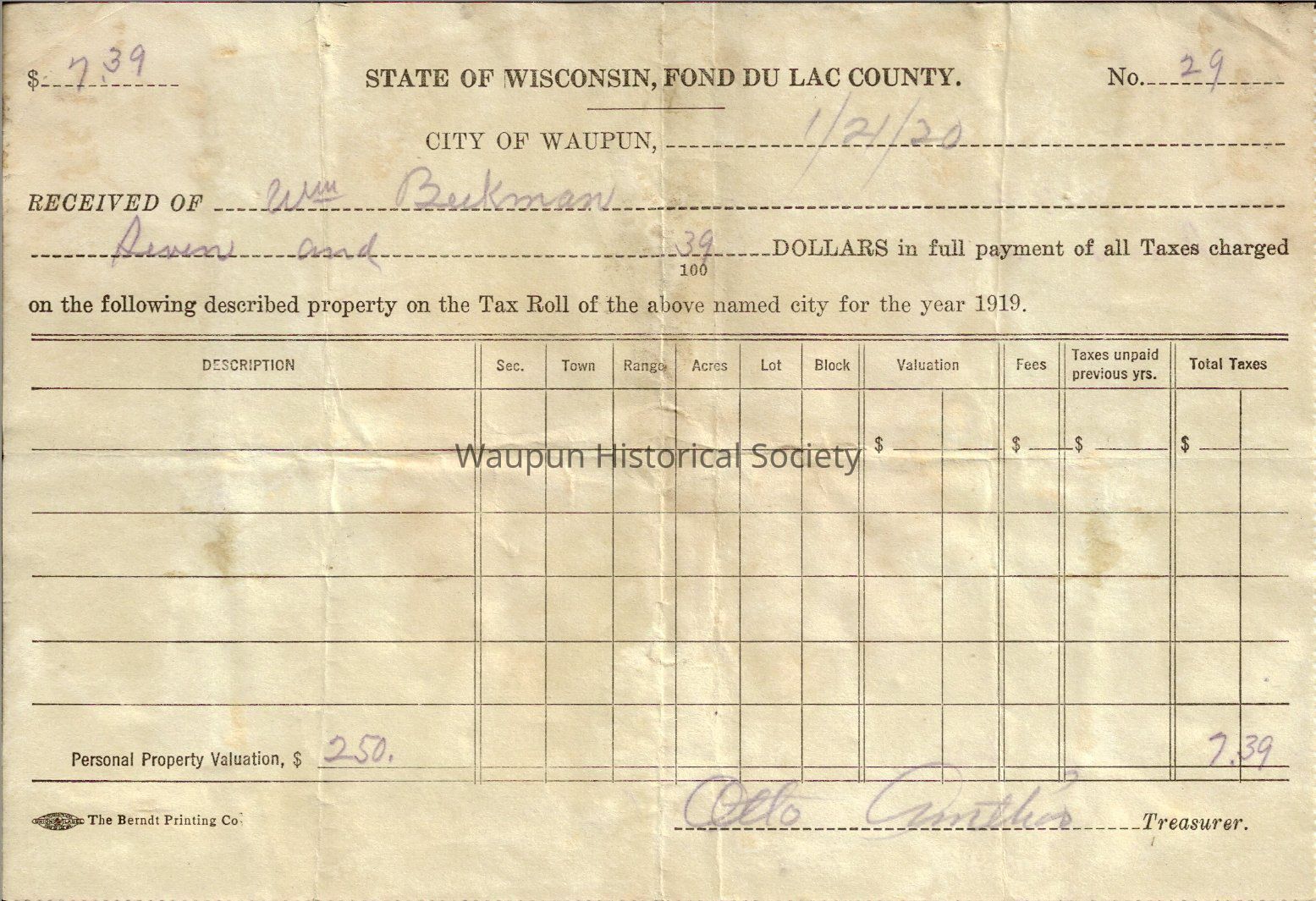Fond du lac Co. Property tax receiptEntry/Object ID
