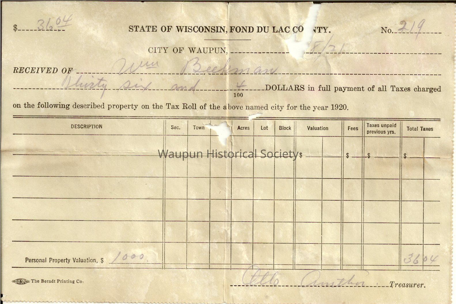 Fond du lac Co. Property tax receiptEntry/Object ID