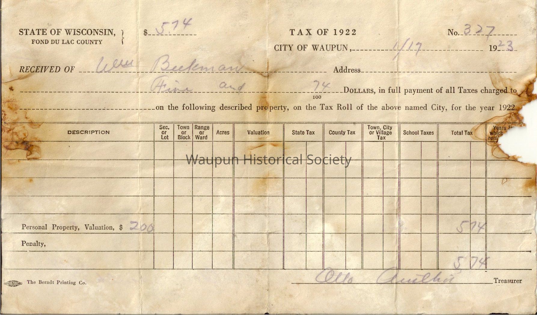 Fond du lac Co. Property tax receiptEntry/Object ID