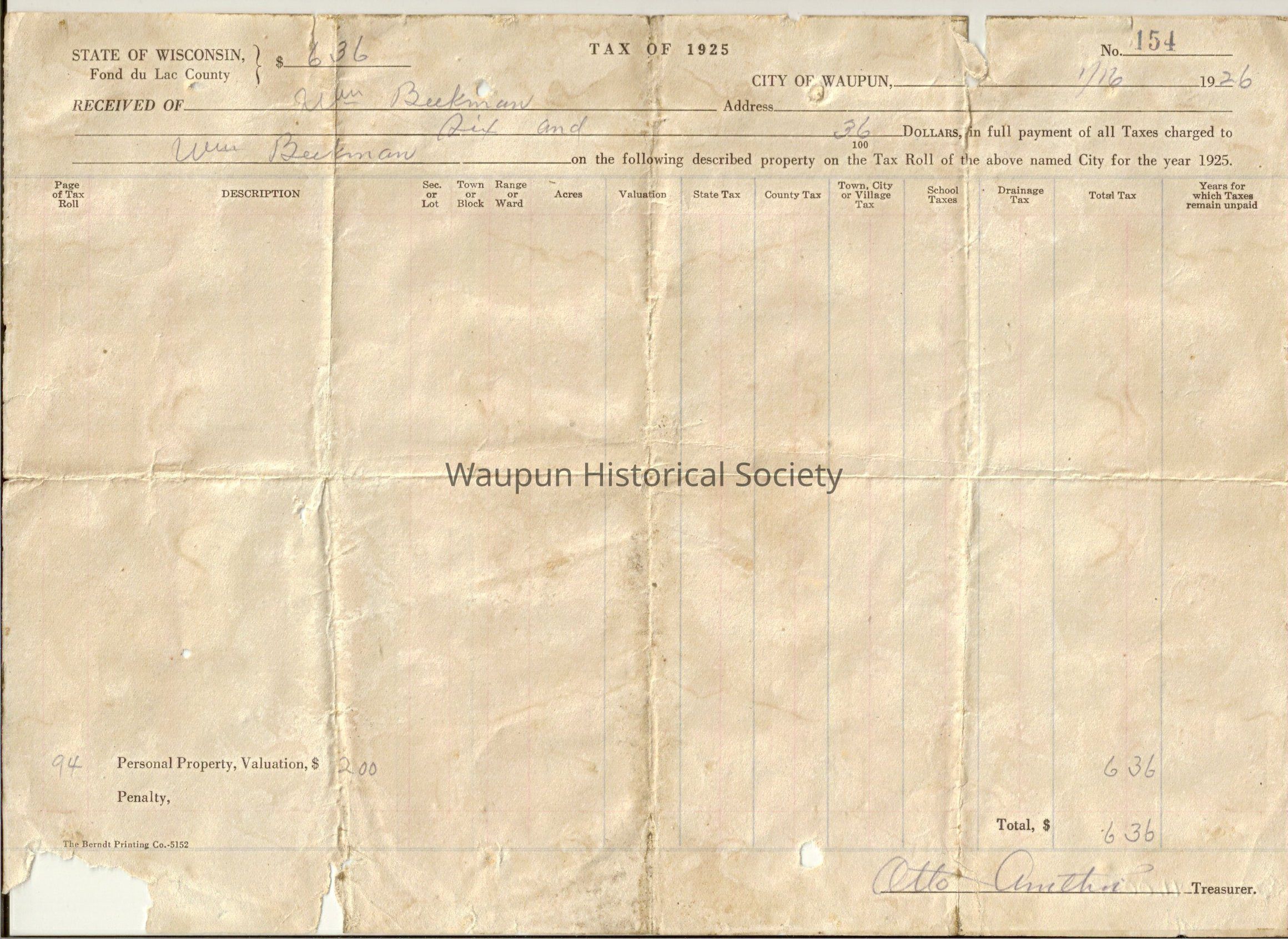 Fond du lac Co. Property tax receiptEntry/Object ID