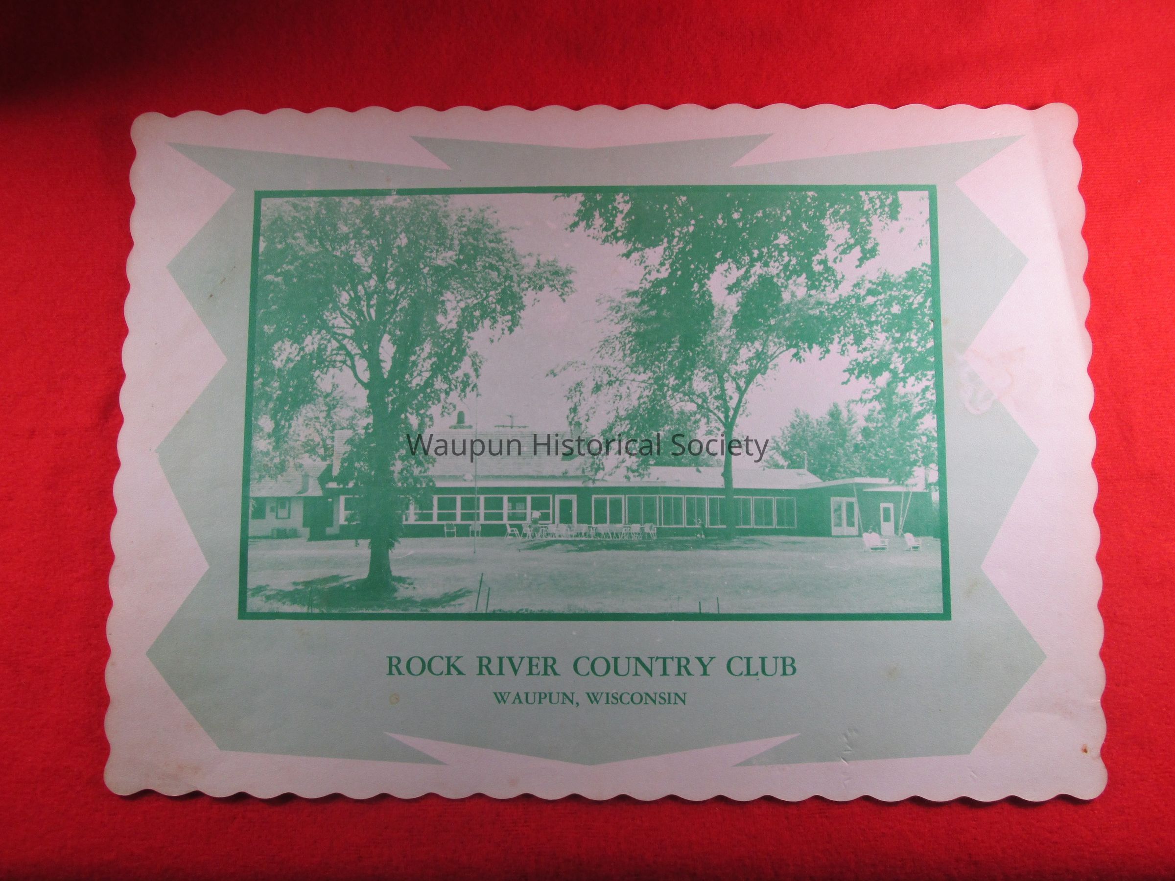 Placemat in ivory and green features a picture of the Rock River Country Club at center . The words Rock River Country Club and Waupun, Wisconsin are printed below the picture.Acquisition