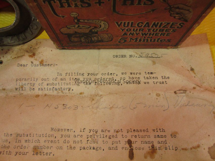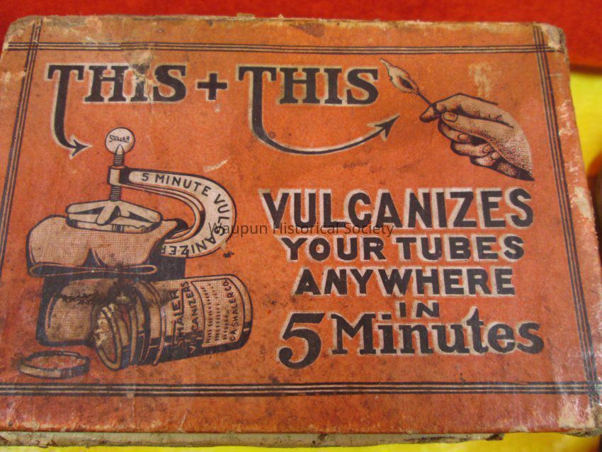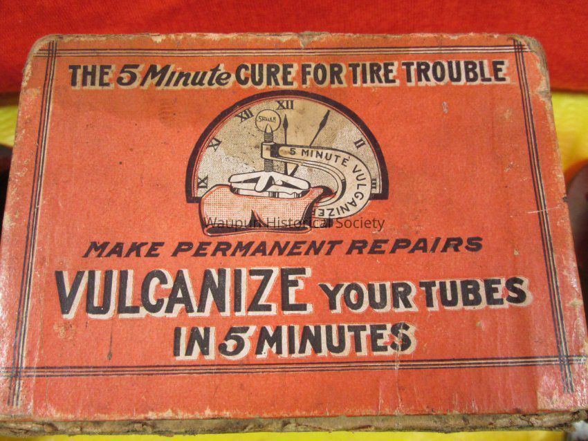 6 - 5 Minute Vulcanizers. 1 is in an orange box with a special order form inside. This particular one is Type M, No., 5 and had one vulcanizer with 12 patches; however, the patches are gone and just the vulcanizer is left. Two of the vulcanizers are quite rusty; two appear unused; one may have had a coat of paint or protection put on it, because it is black.Acquisition