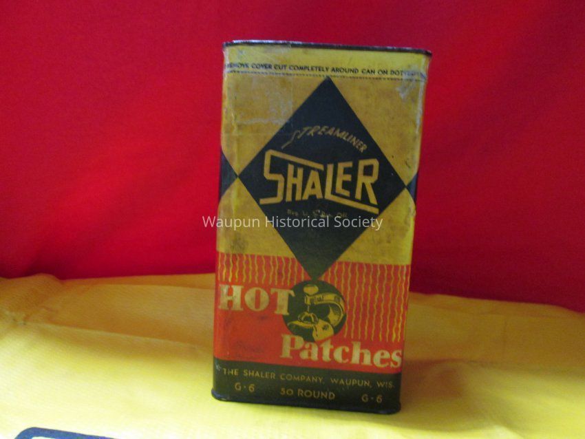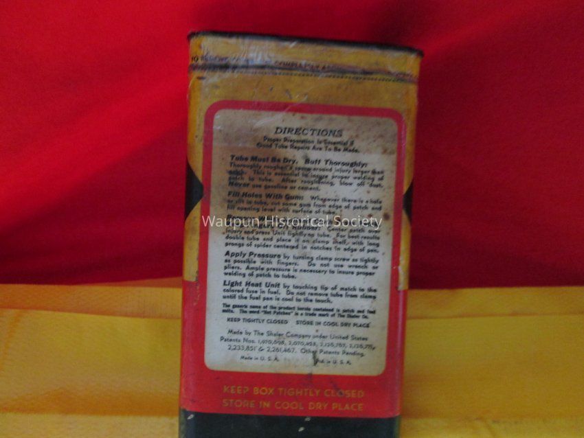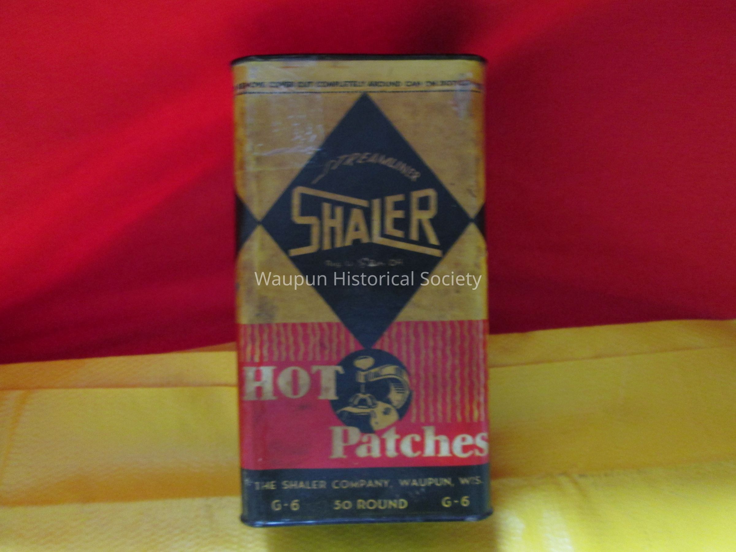 Patches (Hot)made of rubber and uses to fix hole in tubes and tires Content 50 Sold by Shaler Company of Waupun Wis. the can yellow and red in color Round G-6Acquisition