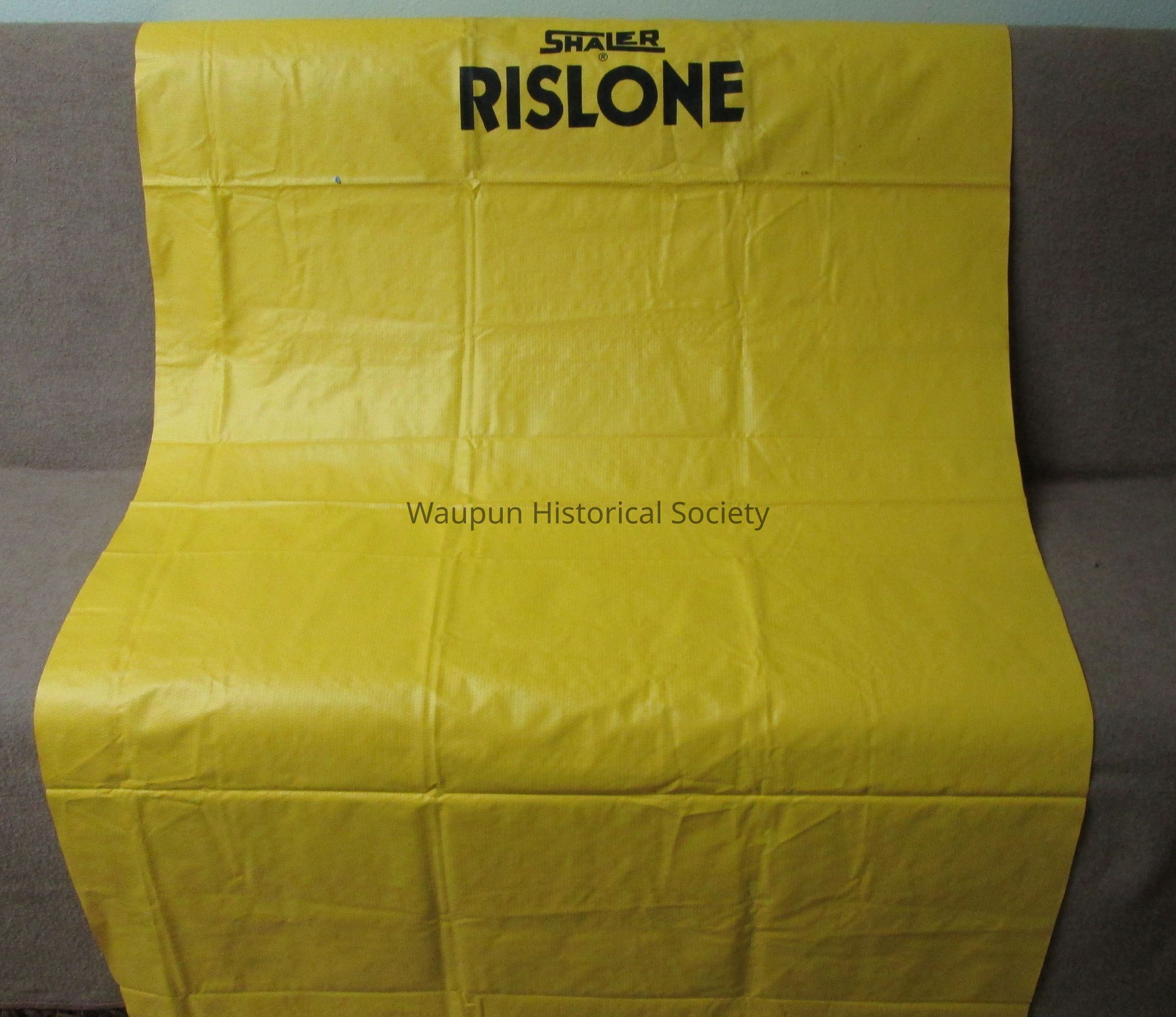 Yellow rubber Shaler RISLONE tarp with bold black lettering. Would have been used to place on the hood or fender of a vehicle, for protection, when it was being repaired.Acquisition