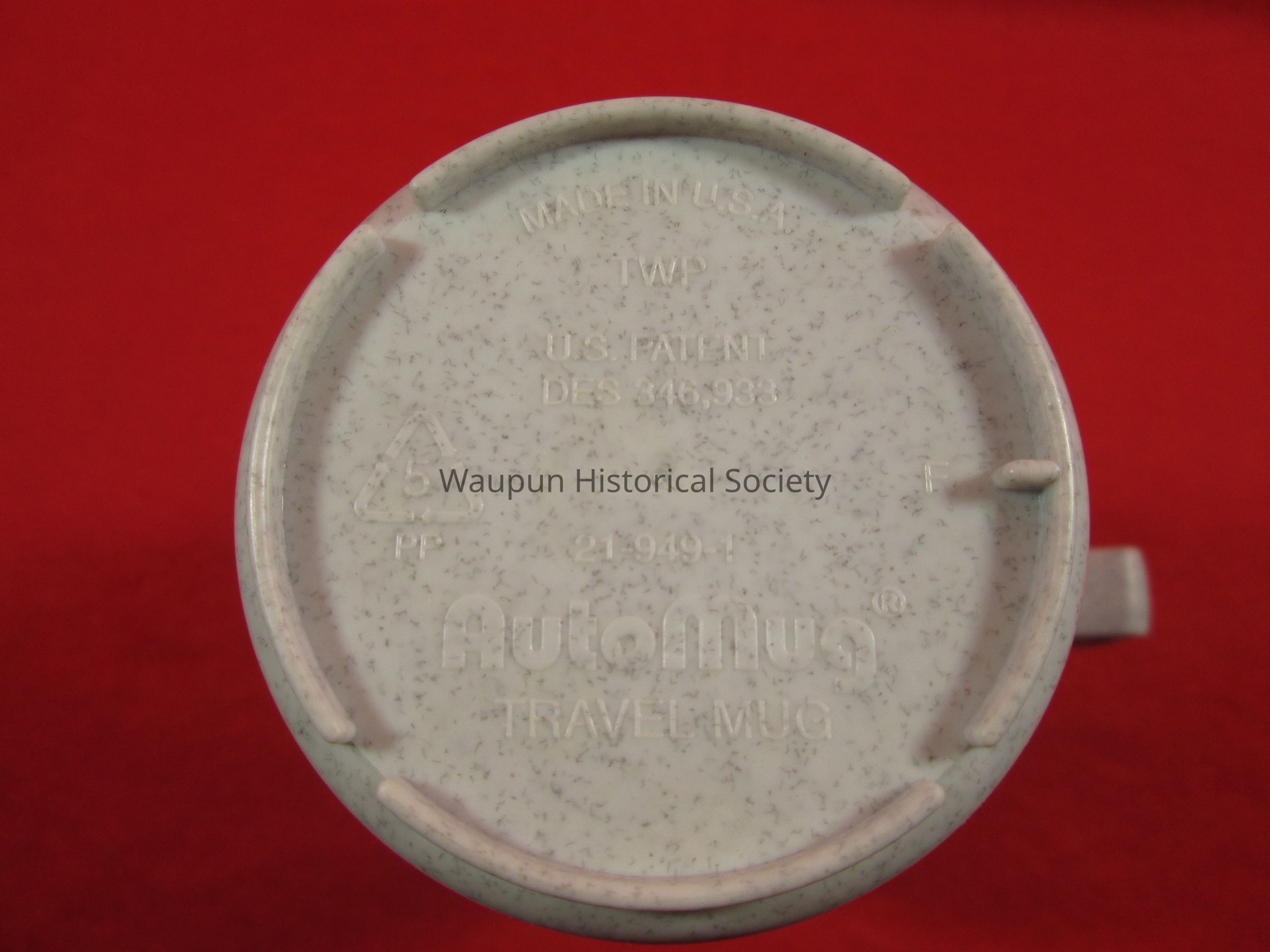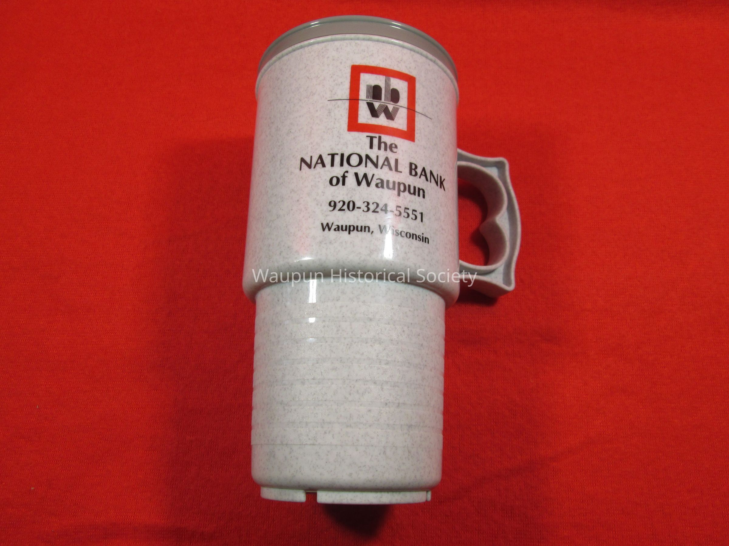Light grey travel mug advertising The National Bank of Waupun, 920-324-5551, Waupun, Wisconsin. On the bottom it also has AutoMug, Travel Mug. There was no lid with the mug.Acquisition