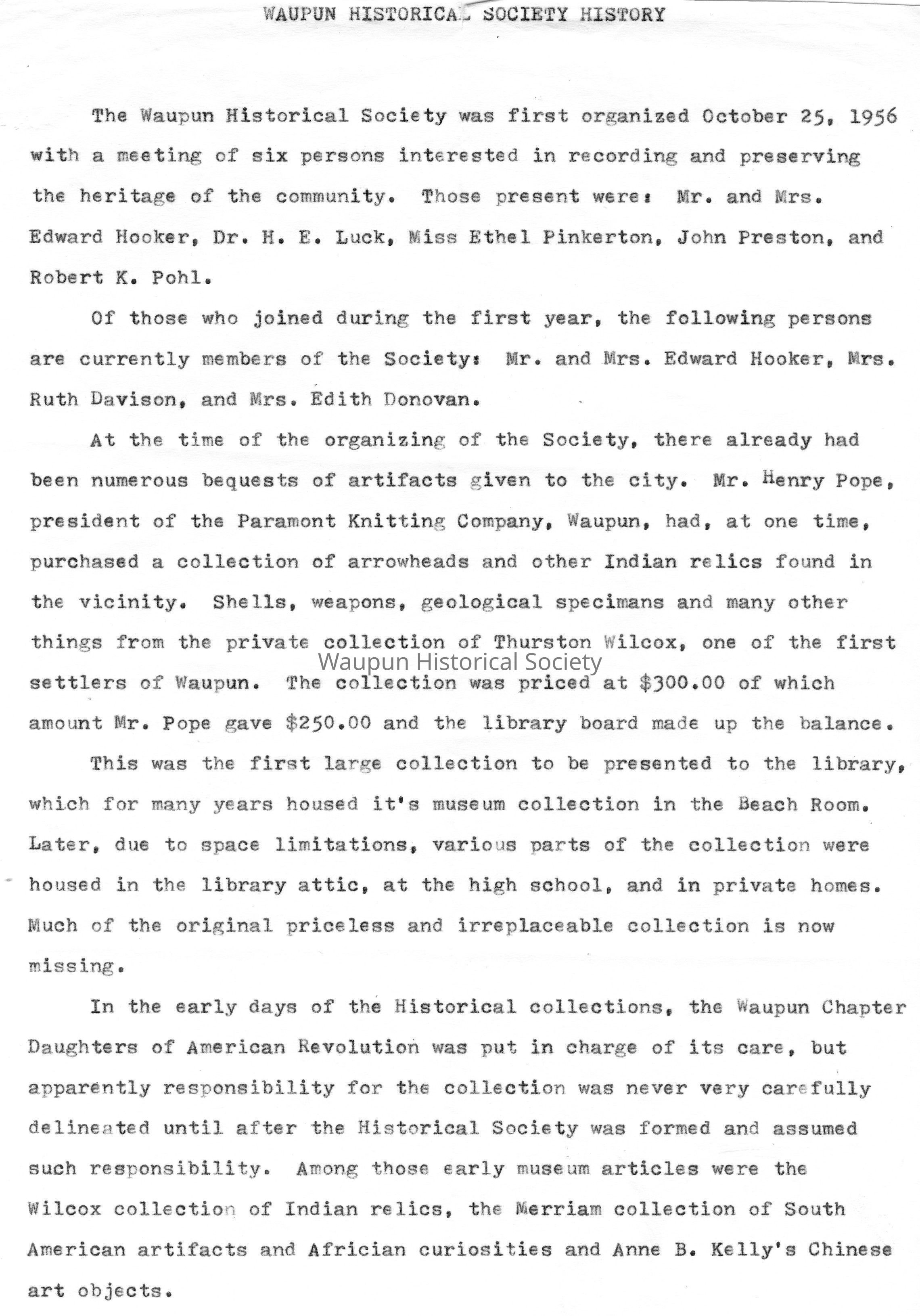 The Waupun Historical Society was first organized October 23, 1956 with a meeting of six persons interested in recording and preserving the heritage of the community. Those present were, Mr. And Mrs. Edward Hooker, Dr. H. E. Luck, Miss Ethel Pinkerton, John Preston, and Robert K. Pohl.