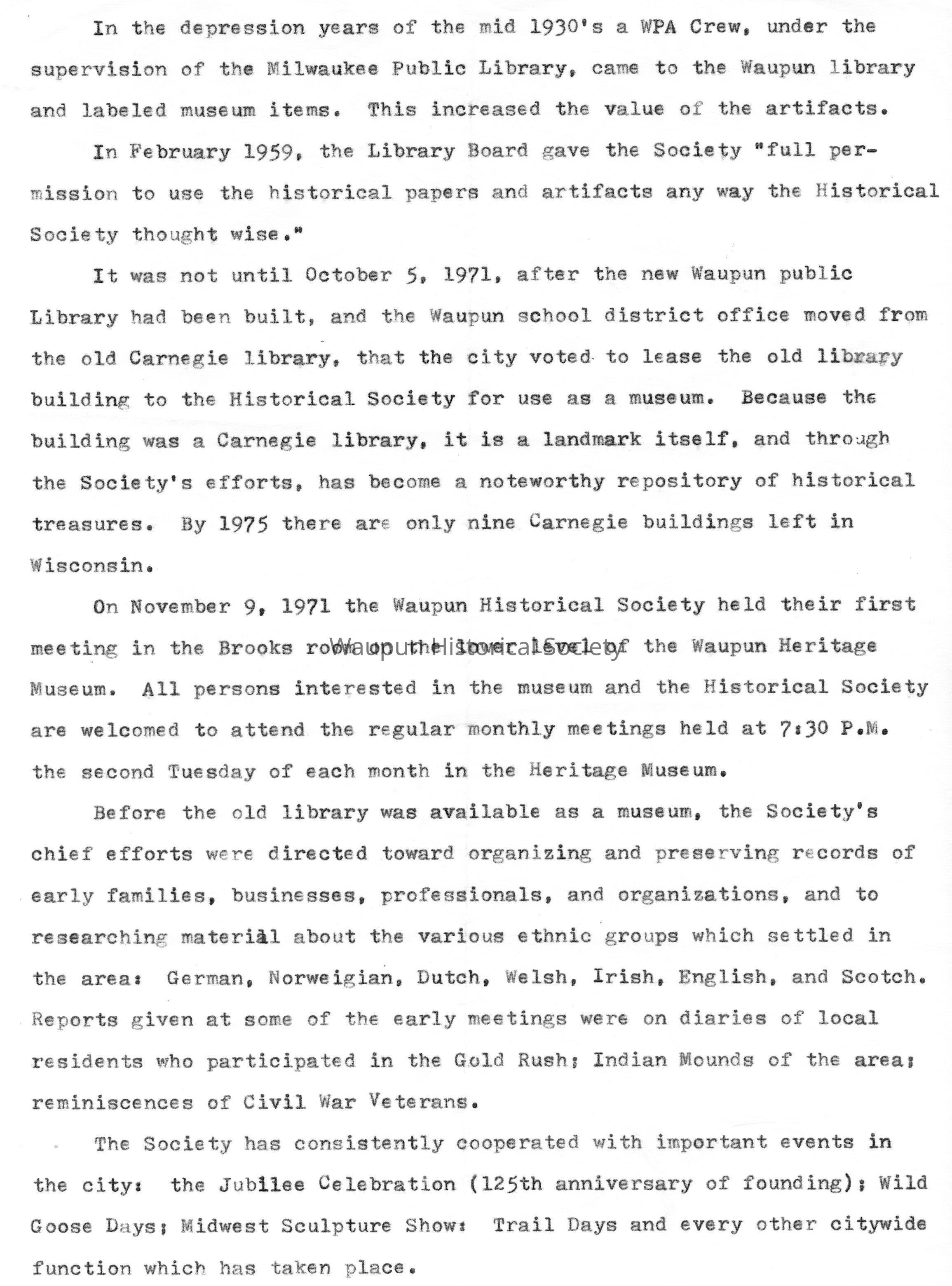 It was not until October 5, 1971, after the new Waupun Public Library had been built, and the Waupun school district offices moved from the old Carnegie Library, that the city voted to lease the old library building to the Historical Society for use as a museum. Because the building was a Carnegie library, it is a landmark itself, and through the Society's efforts, ha become a noteworthy repository of historical treasures. By 1975 there are only nine Carnegie buildings left in Wisconsin.