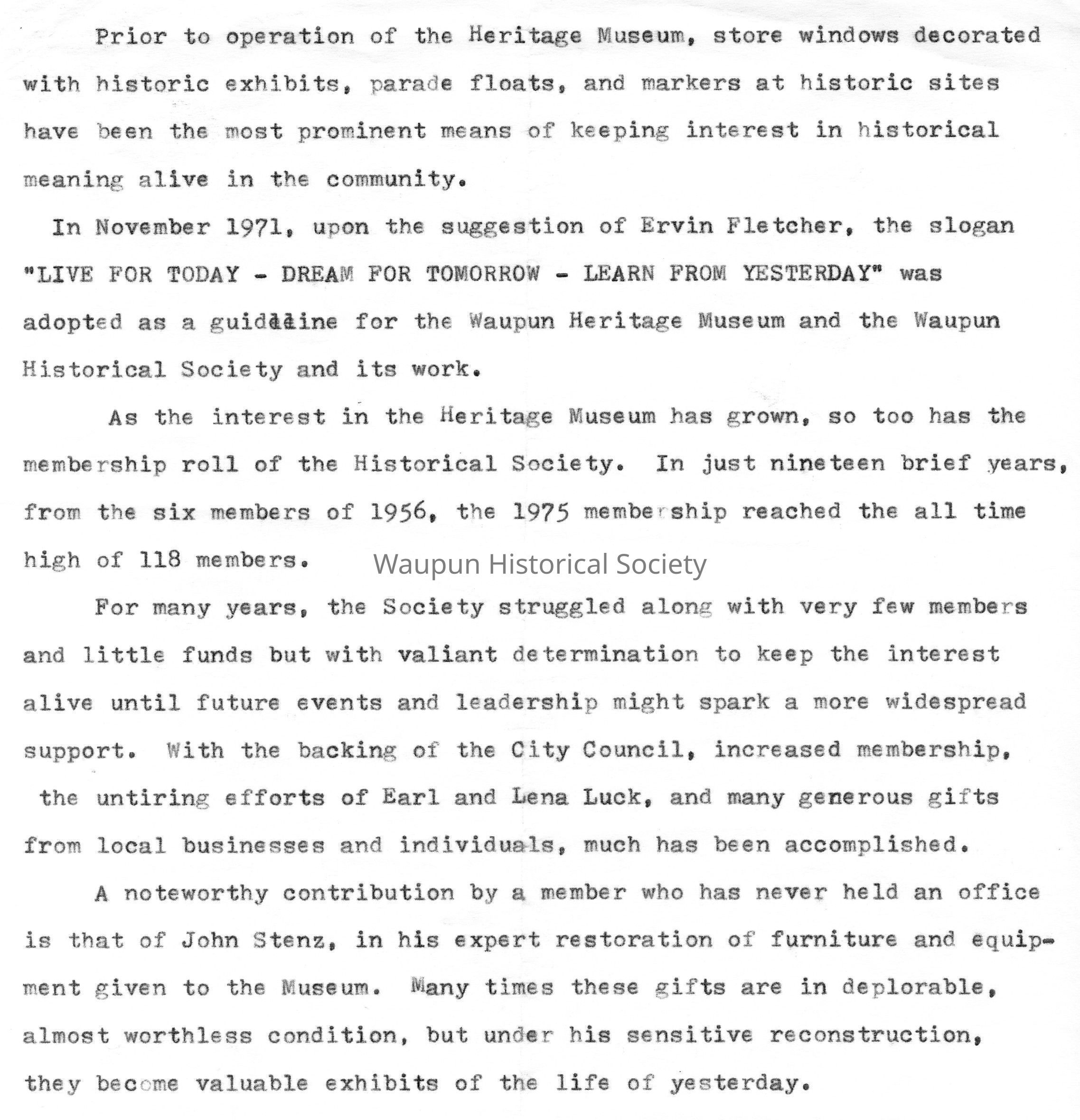 In November 1971, upon the suggestion of Ervin Fletcher, the slogan "Live For Today - Dream For Tomorrow- Learn From Yesterday" was adopted as a guideline for the Waupun Heritage Museum and the Waupun Historical Society and its work.