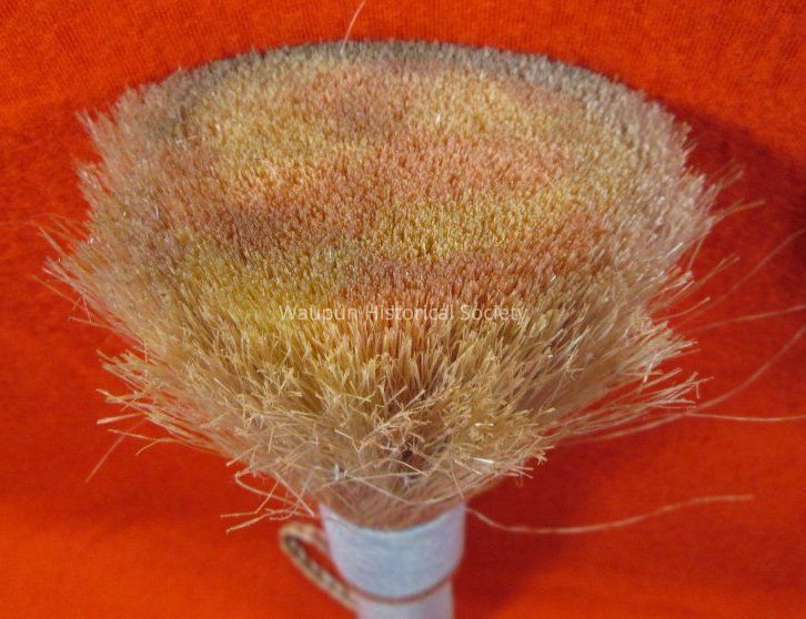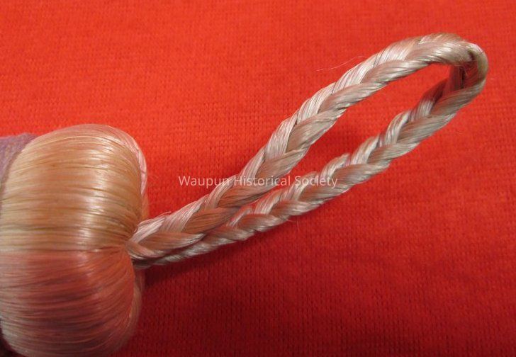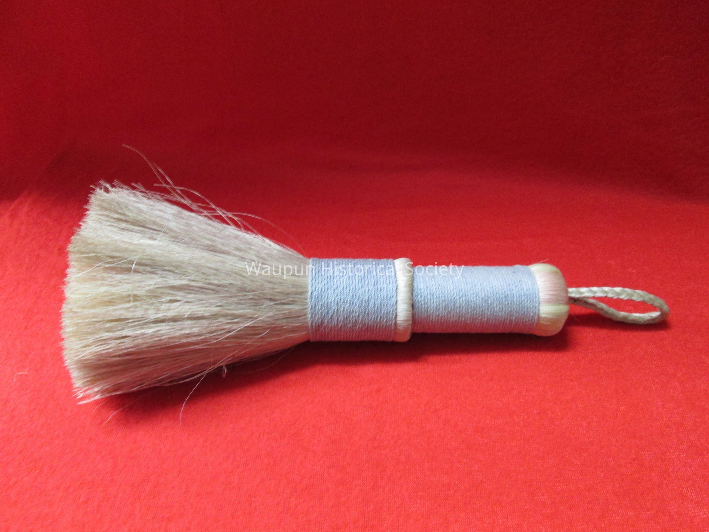 Wisk broom made by Jeanette Giebink, daughter of Doris(father) and Liza(mother) Giebink, at craft company above Bill Giebink Chicken Hatchery (feed store), Main St., Waupun, across from VandeBerg Garage around 1940. Not sure of the name of the craft company. The material of the broom is a soft hemp, cream and pink in color. The handle is wrapped with a grey colored band and the hook is made of braided cream hemp. It is very similar to the wisk brooms made at the Waupun prison.