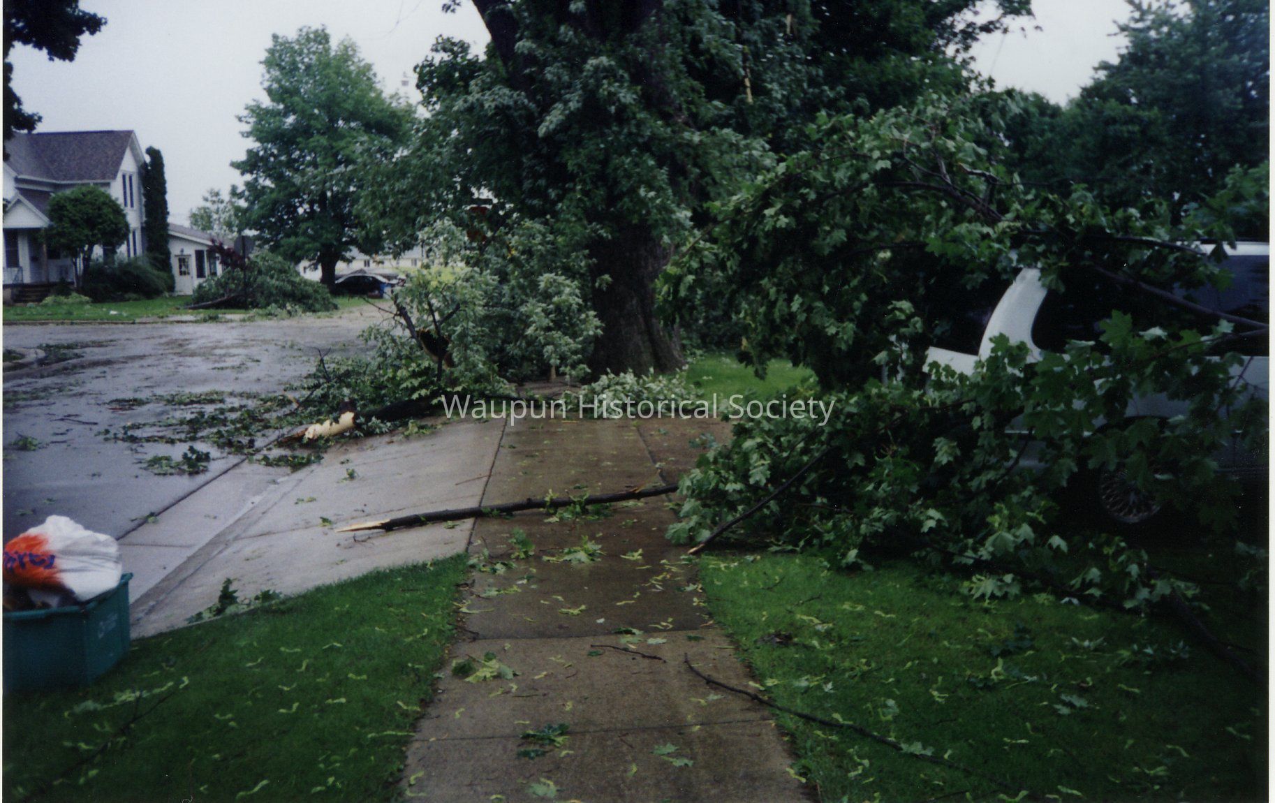 2004 Tornado. These photos were on loan from Gene and Betty Buchholz. They were returned to them after they were scanned. The only copies the Waupun Historical Society has are the electronic versions on disk. Caption on the back indicates "Van Partly uncovered 6-30-04."Acquisition