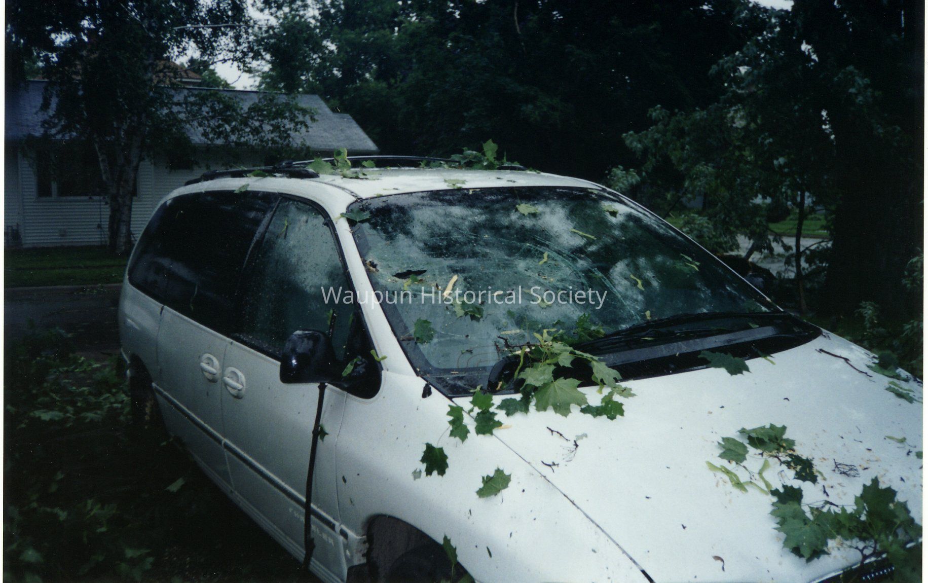 2004 Tornado. These photos were on loan from Gene and Betty Buchholz. They were returned to them after they were scanned. The only copies the Waupun Historical Society has are the electronic versions on disk. Caption on the back indicates, " See holes in Windshield! 6-30-04 Storm"Acquisition