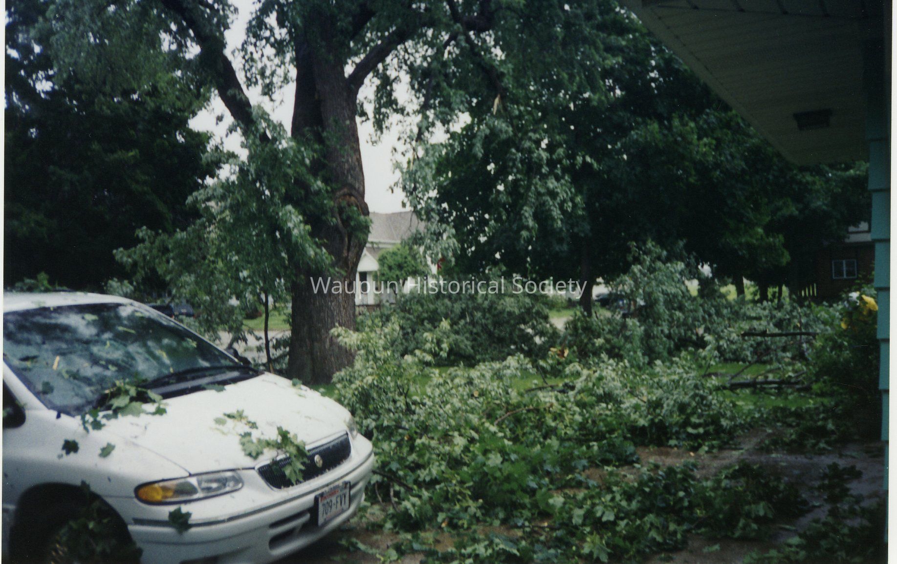 2004 Tornado. These photos were on loan from Gene and Betty Buchholz. They were returned to them after they were scanned. The only copies the Waupun Historical Society has are the electronic versions on disk. Caption on the back indicates, " By golly, there was a van & broken windshield under all that brush 6-30-04."Acquisition