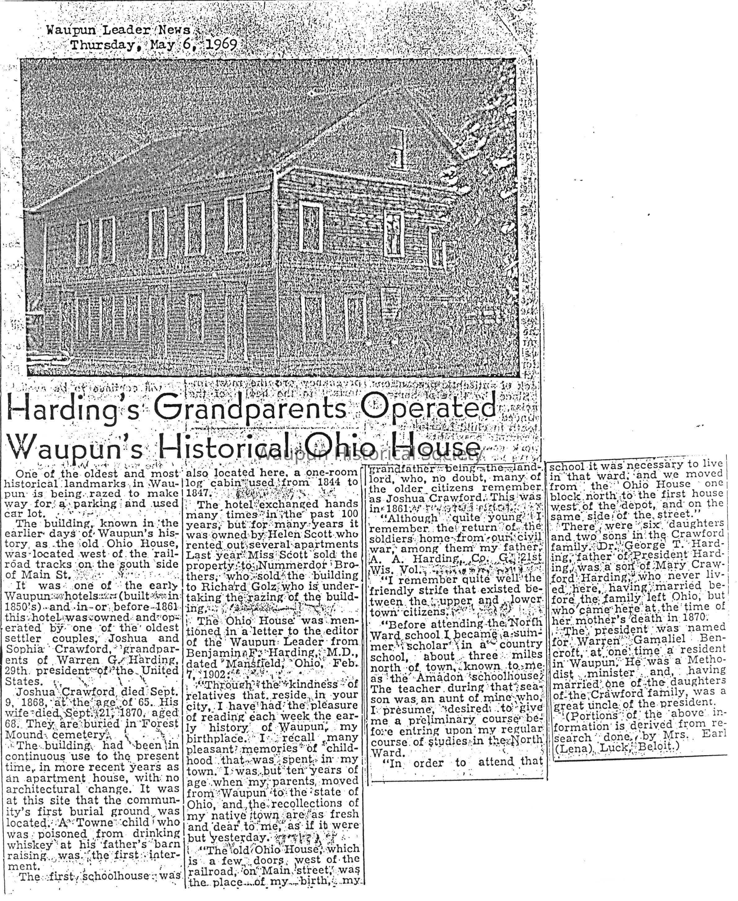 Harding's Grandparents Operated Ohio House from the Waupun Leader News May 6,1969