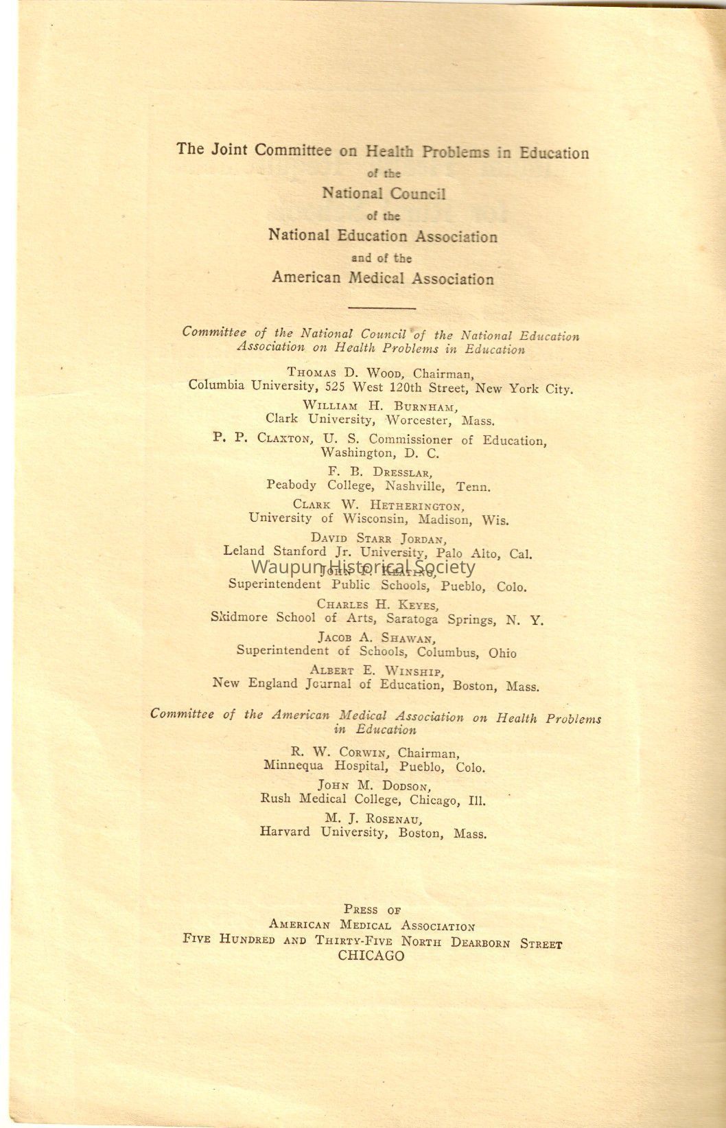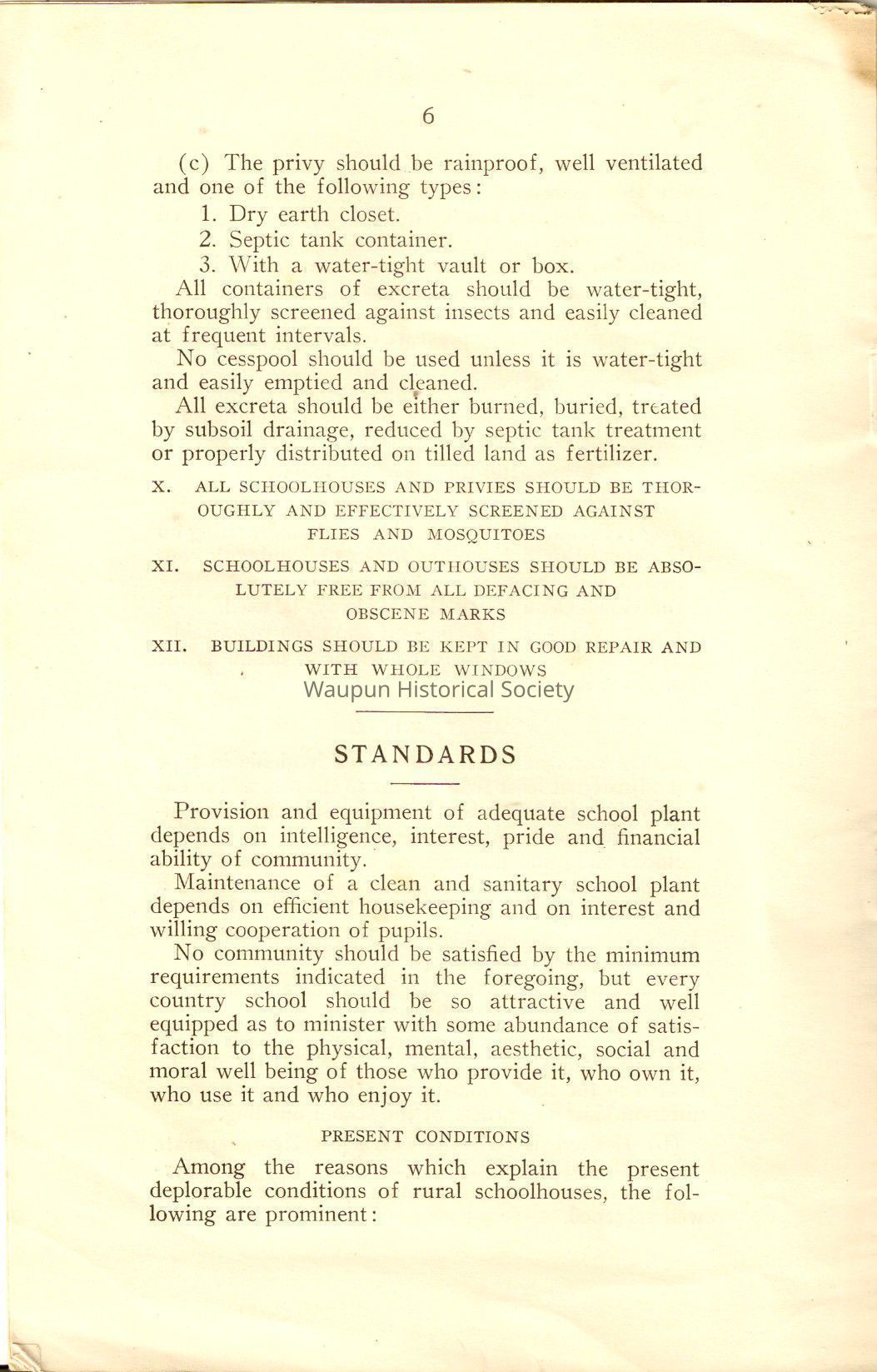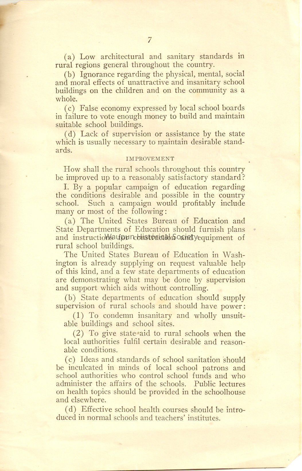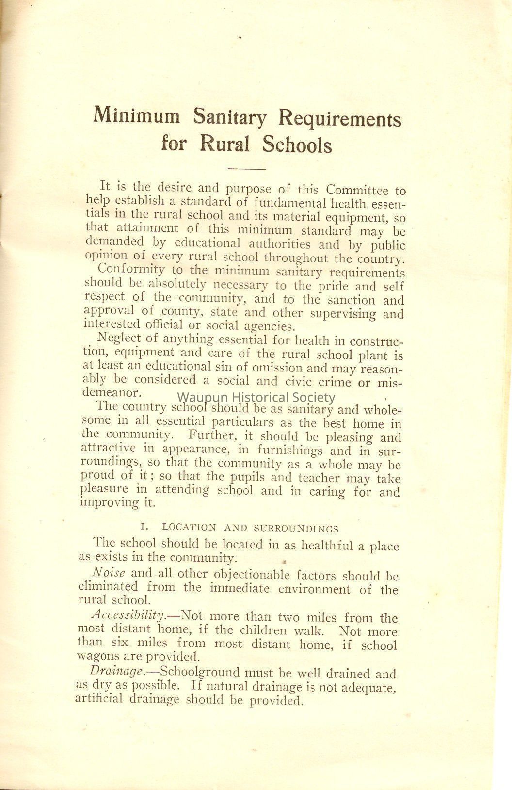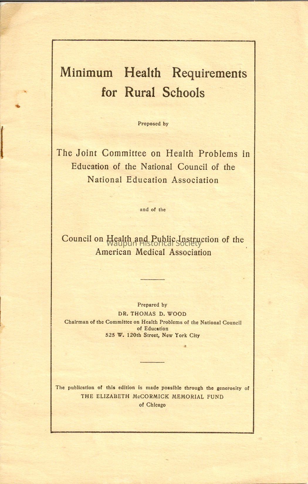 It is the desire and purpose of this Committee to help establish a standard of fundamental health essentials in the rural school and its material equipment, so that attainment of this minimum standard may be demanded by educational authorities and by public opinion of every rural school throughout the country.