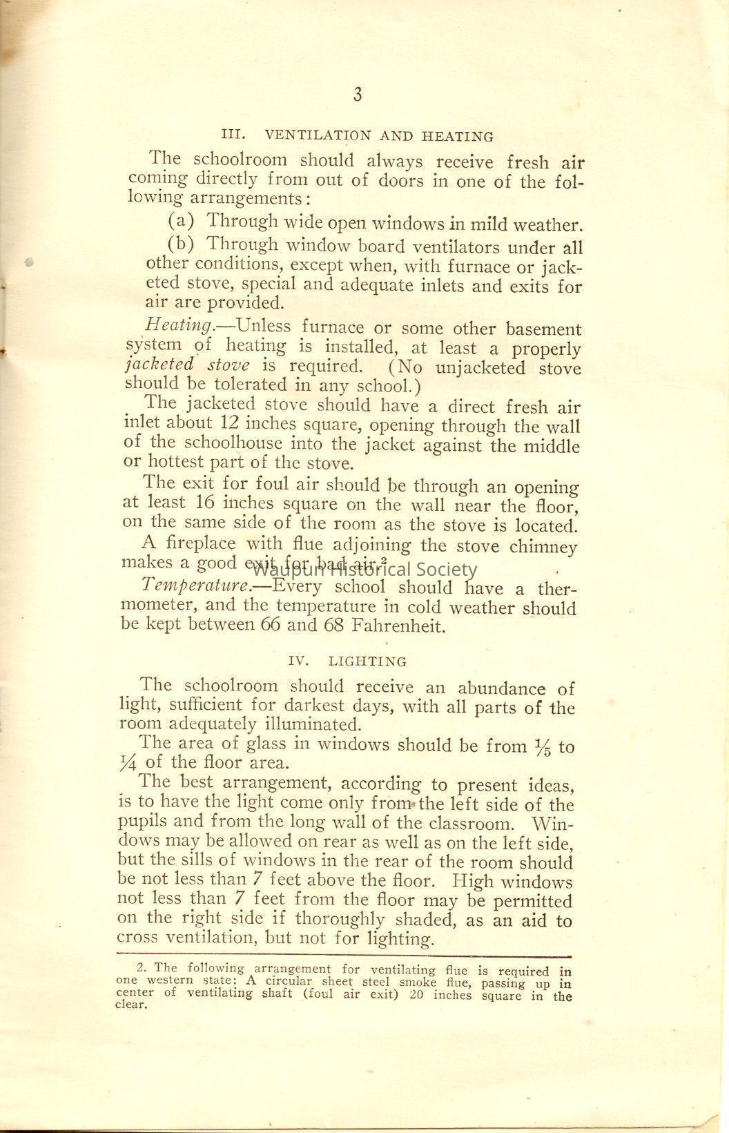 1. Heating by at least a properly jacketed stove. (No unjacketed stove to be allowed.) Avoid overheating. Temperature should never go above 68 F. There should be a thermometer in every schoolroom.