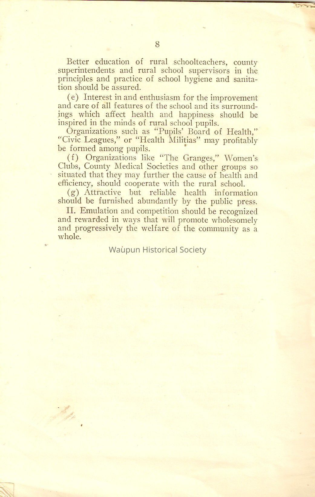 Better education of rural schoolteachers, county superintendents and rural school supervisors in the principles and practice of school hygiene and sanitation should be assured.