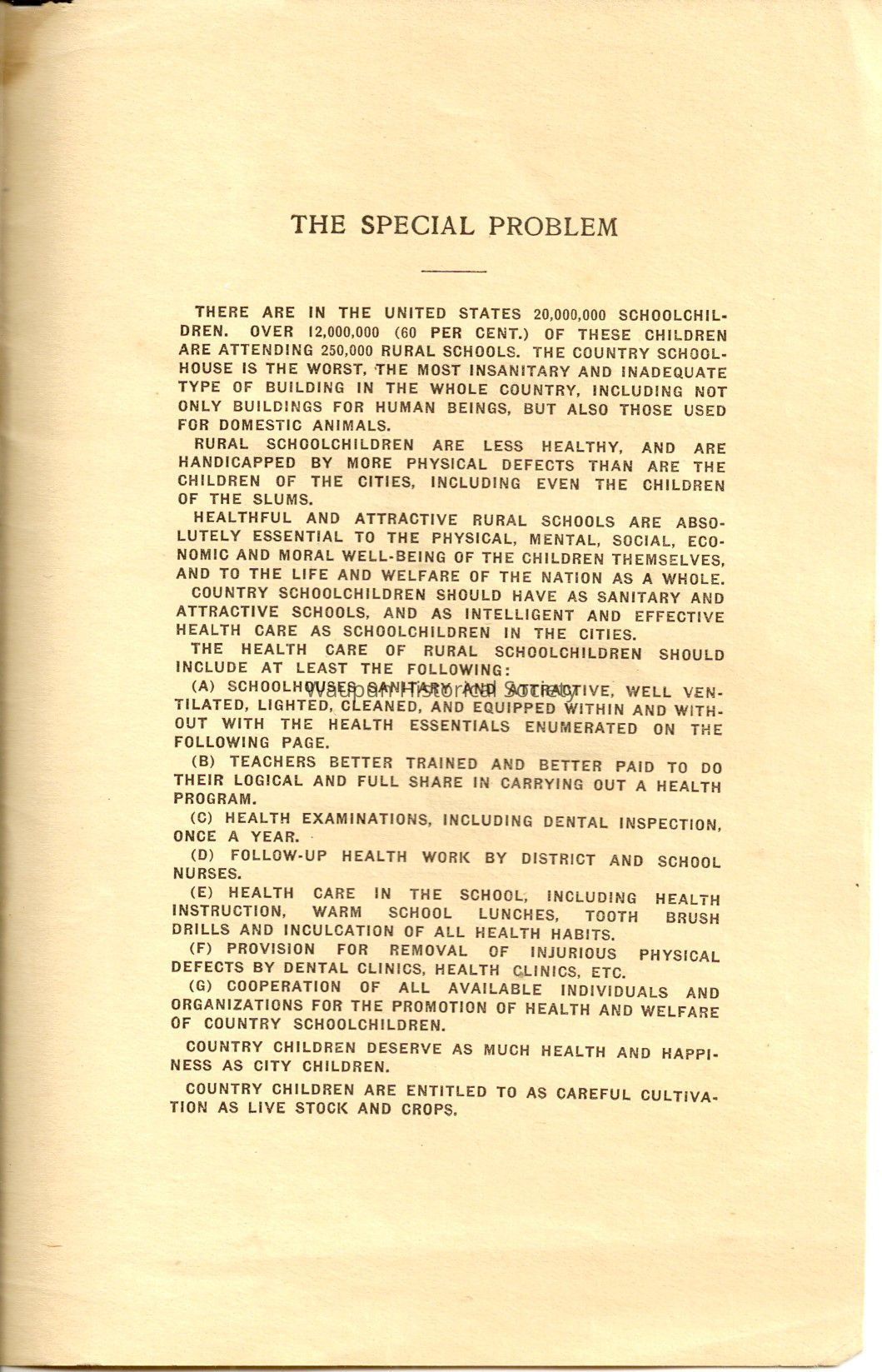 COUNTRY SCHOOLCHILDREN SHOULD HAVE AS SANITARY AND ATTRACTIVE SCHOOLS, AND AS INTELLIGENT AND EFFECTIVE HEALTH CARE AS SCHOOLCHILDREN IN THE CITIES.