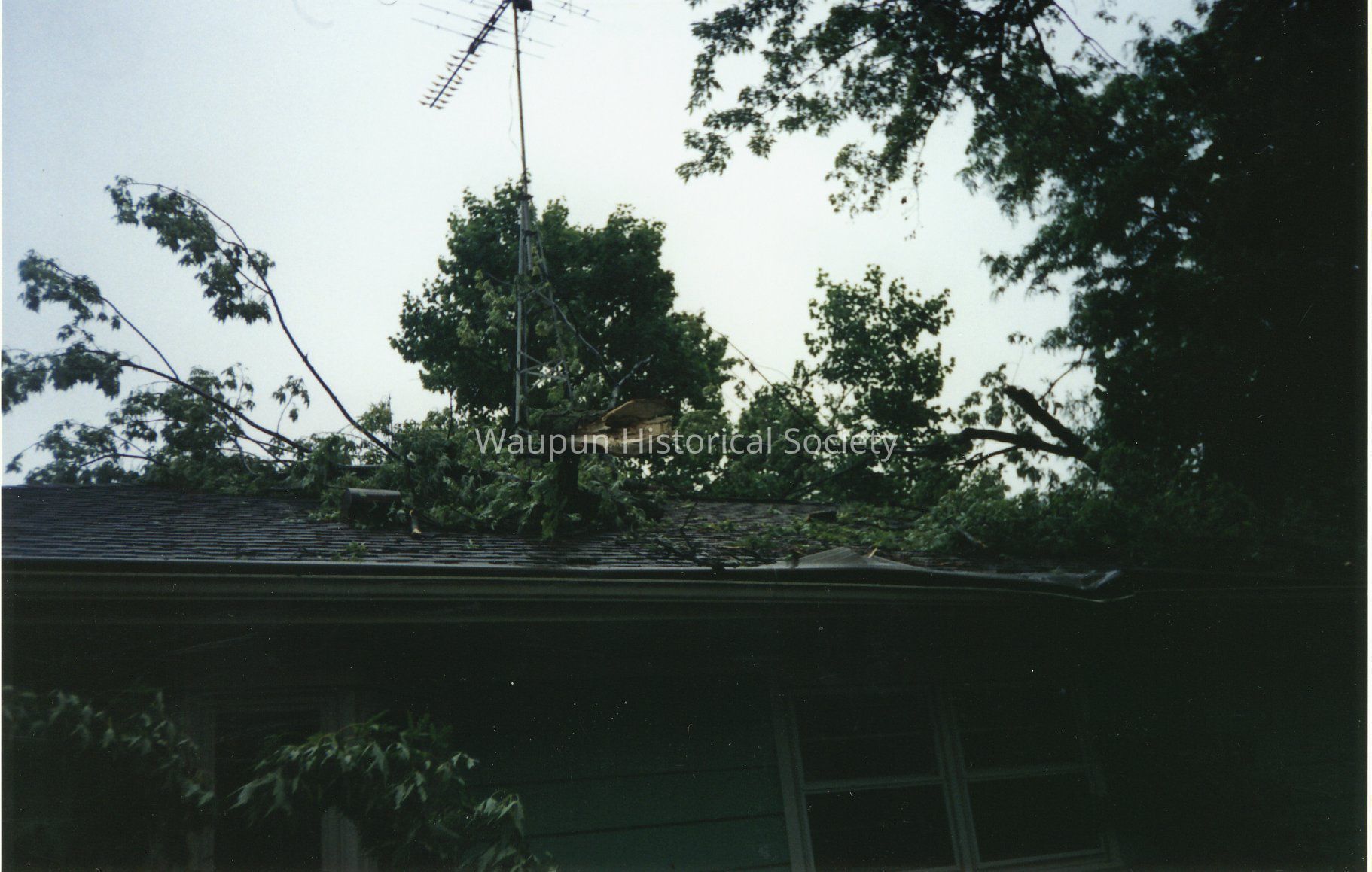 2004 Tornado. These photos were on loan from Gene and Betty Buchholz. They were returned to them after they were scanned. The only copies the Waupun Historical Society has are the electronic versions on disk. Caption on the back indicates, " More roof scenes from West 6-30-04."Acquisition