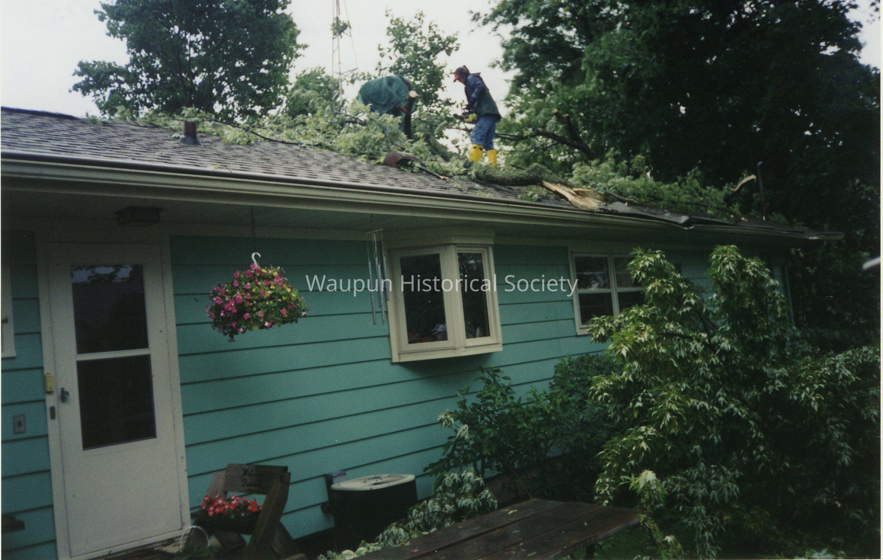 2004 Tornado. These photos were on loan from Gene and Betty Buchholz. They were returned to them after they were scanned. The only copies the Waupun Historical Society has are the electronic versions on disk. Caption on the back indicates, " John Smedema and cousin clearing roof after 6-30-04 storm."Acquisition