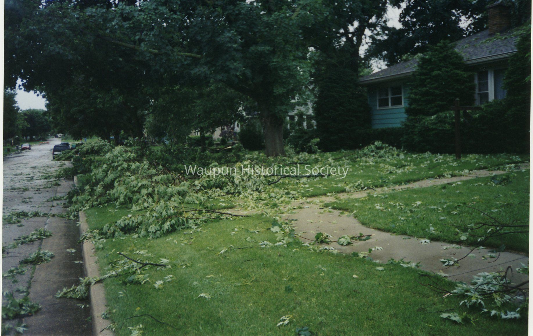2004 Tornado. These photos were on loan from Gene and Betty Buchholz. They were returned to them after they were scanned. The only copies the Waupun Historical Society has are the electronic versions on disk. Caption on the back indicates, Front Yard after storm of 6-30-04."Acquisition