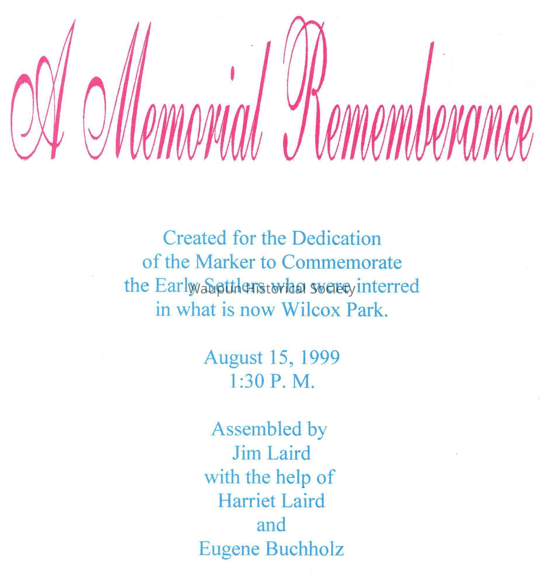 Created for the Dedication of the Marker to Commemorate the Early Settlers who were interred