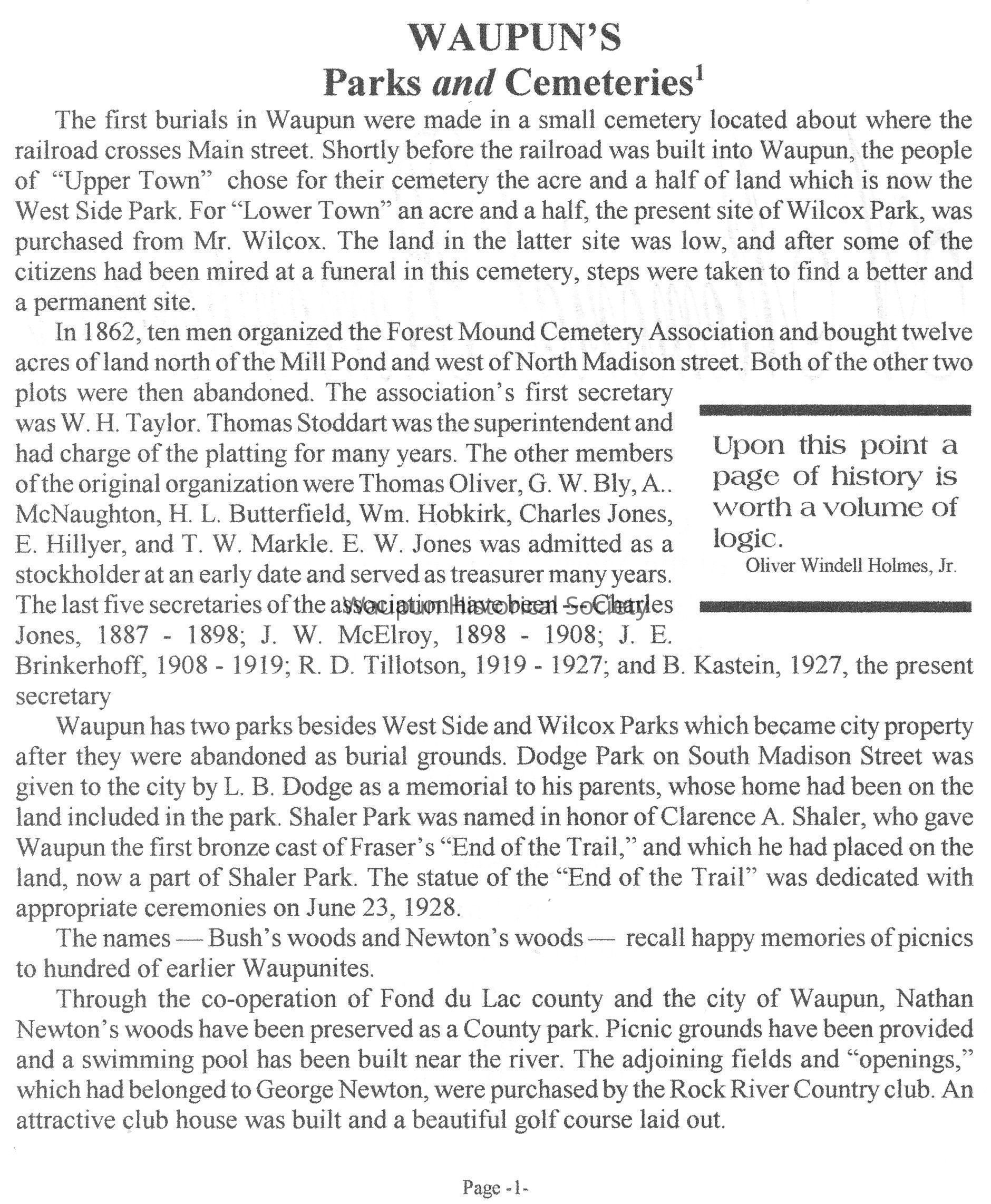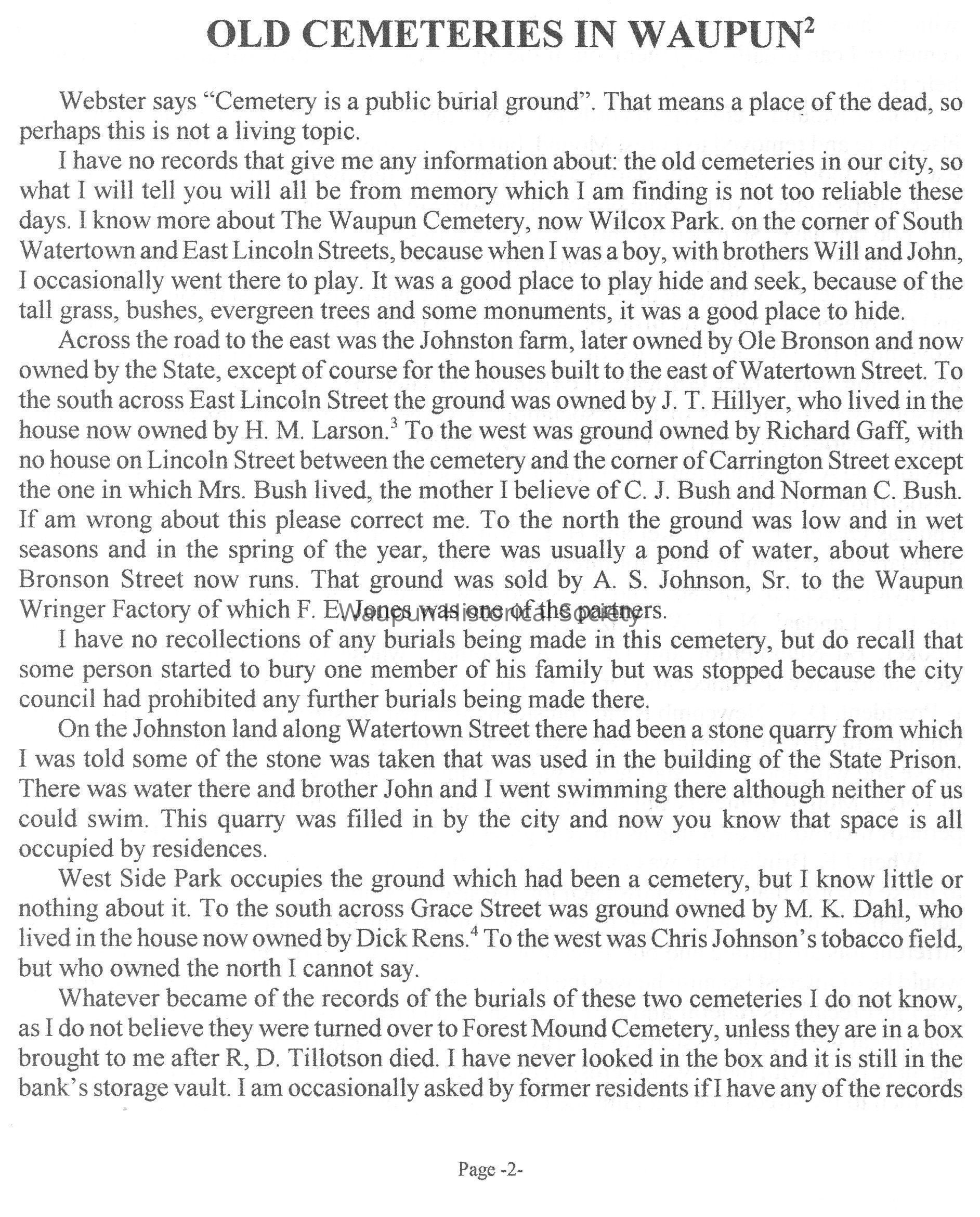 I have no records that give me any information about: the old cemeteries in our city, so what I will tell you will all be from memory which I am finding is not too reliable these days. I know more about The Waupun Cemetery, now Wilcox Park. on the corner of South Watertown and East Lincoln Streets, because when I was a boy, with brothers Will and John, I occasionally went there to play. It was a good place to play hide and seek, because of the tall grass, bushes, evergreen trees and some monuments, it was a good place to hide.