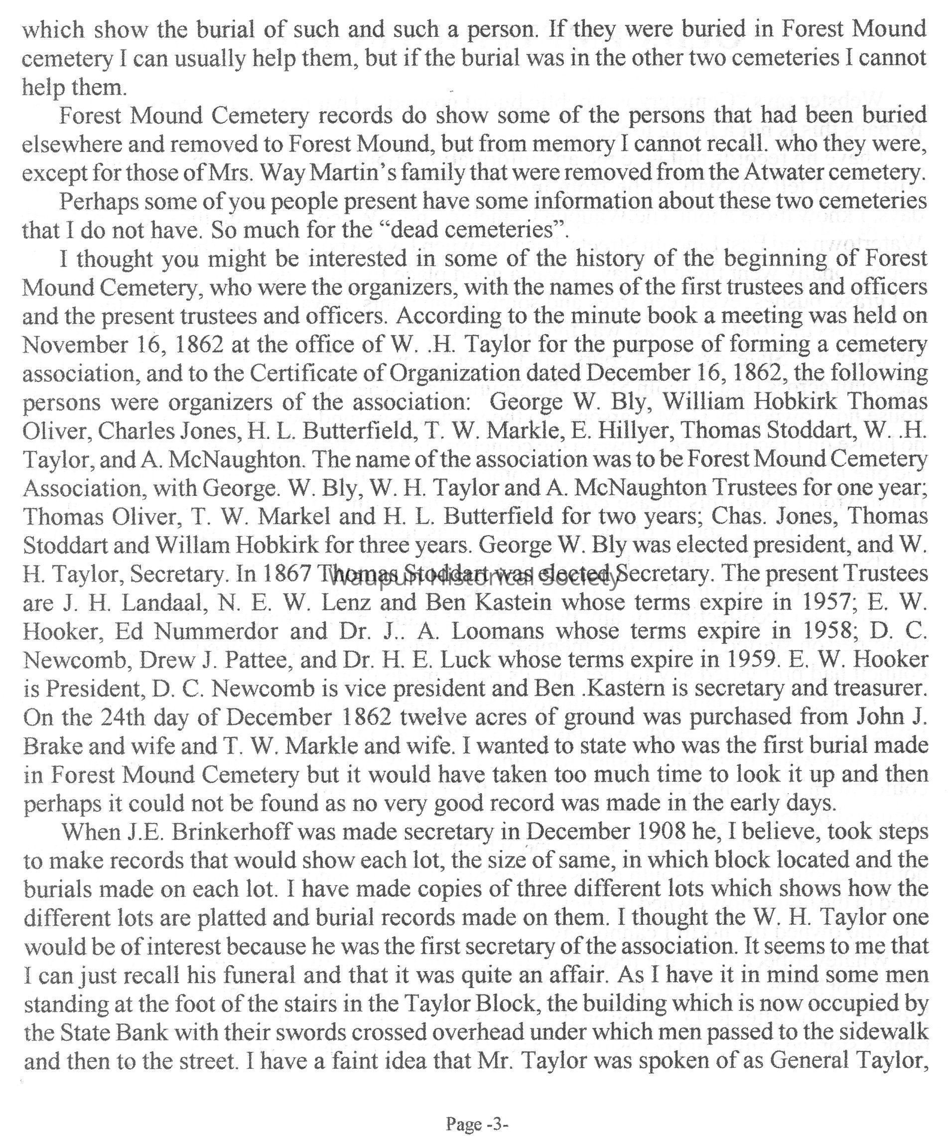 I thought you might be interested in some of the history of the beginning of Forest Mound Cemetery, who were the organizers, with the names of the first trustees and officers and the present trustees and officers. According to the minute book a meeting was held on November 16, 1862 at the office of W. .H. Taylor for the purpose of forming a cemetery association, and to the Certificate of Organization dated December 16, 1862, the following persons were organizers of the association: George W. Bly, William Hobkirk Thomas Oliver, Charles Jones, H. L. Butterfield, T. W. Markle, E. Hillyer, Thomas Stoddart, W. .H. Taylor, and A. McNaughton. The name of the association was to be Forest Mound Cemetery Association, with George. W. Bly, W. H. Taylor and A. McNaughton Trustees for one year; Thomas Oliver, T. W. Markel and H. L. Butterfield for two years; Chas. Jones, Thomas Stoddart and Wiliam Hobkirk for three years. George W. Bly was elected president, and W. H. Taylor, Secretary. In 1867 Thomas Stoddart was elected Secretary. The present Trustees are J. H. Landaal, N. E. W. Lenz and Ben Kastein whose terms expire in 1957; E. W. Hooker, Ed Nummerdor and Dr. J.. A. Loomans whose terms expire in 1958; D. C. Newcomb, Drew J. Pattee, and Dr. H. E. Luck whose terms expire in 1959. E. W. Hooker is President, D. C. Newcomb is vice president and Ben .Kastern is secretary and treasurer. On the 24th day of December 1862 twelve acres of ground was purchased from John J. Brake and wife and T. W. Markle and wife. I wanted to state who was the first burial made in Forest Mound Cemetery but it would have taken too much time to look it up and then perhaps it could not be found as no very good record was made in the early days.