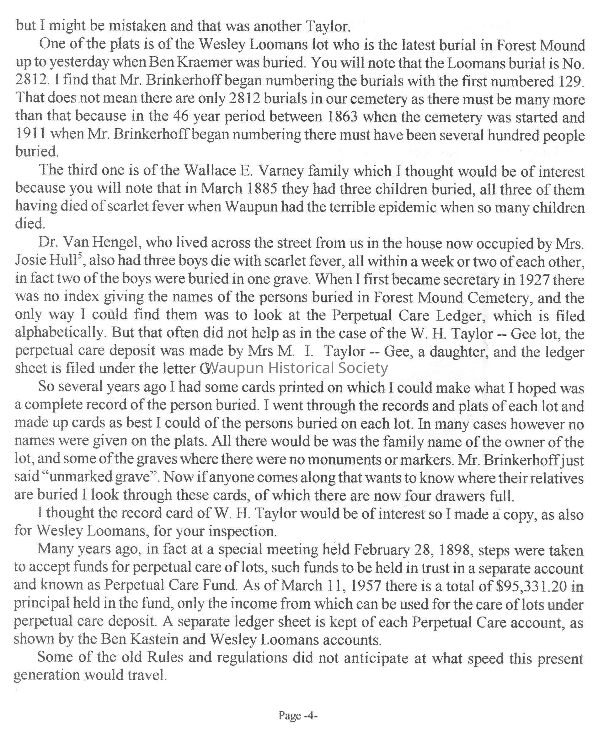 Dr. Van Hengel, who lived across the street from us in the house now occupied by Mrs. Josie Hull (5), also had three boys die with scarlet fever, all within a week or two of each other, in fact two of the boys were buried in one grave. When I first became secretary in 1927 there was no index giving the names of the persons buried in Forest Mound Cemetery, and the only way I could find them was to look at the Perpetual Care Ledger, which is filed alphabetically. But that often did not help as in the case of the W. H. Taylor -- Gee lot, the perpetual care deposit was made by Mrs M. I. Taylor -- Gee, a daughter, and the ledger sheet is filed under the letter G.