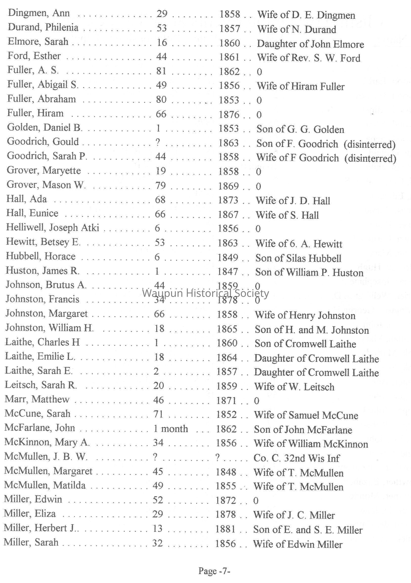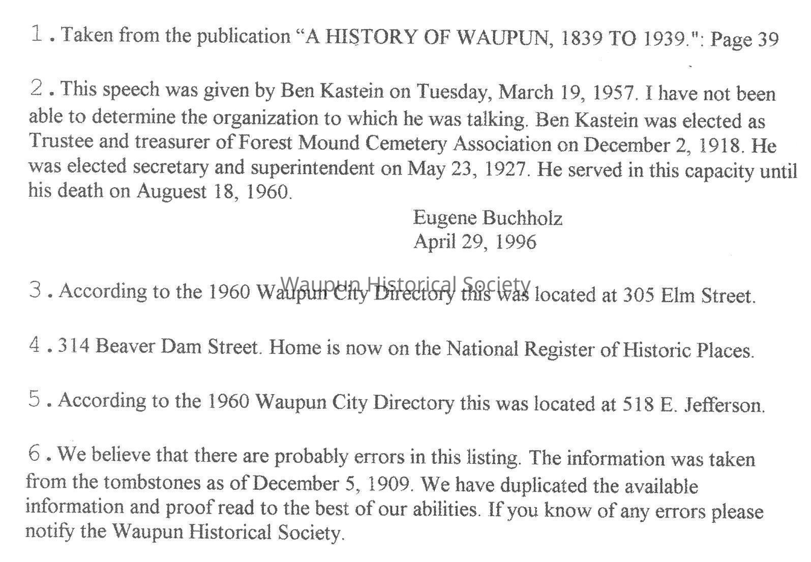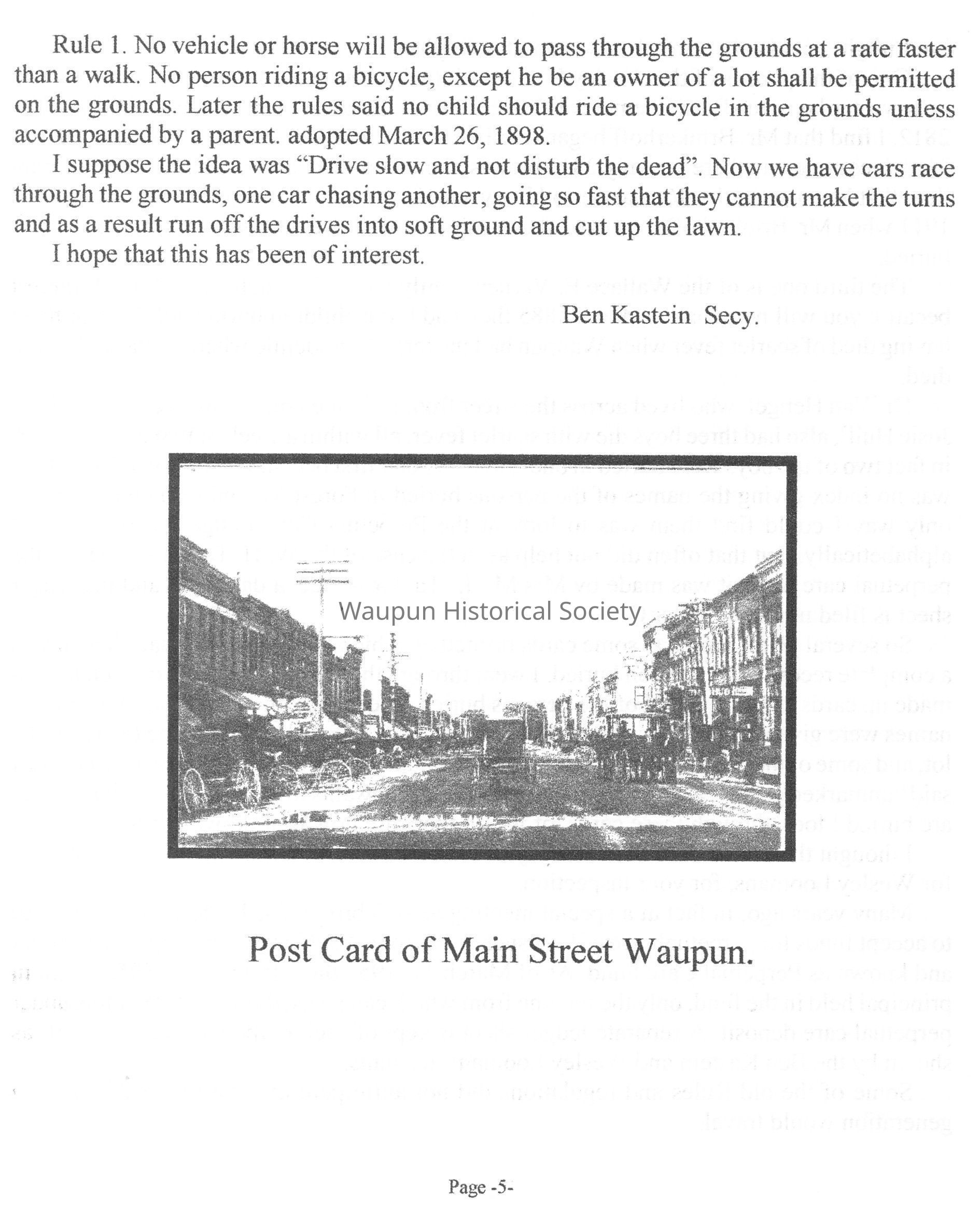 Across the road to the east was the Johnston farm, later owned by Ole Bronson and now owned by the State, except of course for the houses built to the east of Watertown Street. To the south across East Lincoln Street the ground was owned by J. T. Hillyer, who lived in the house now owned by H. M. Larson.(3) To the west was ground owned by Richard Gaff, with no house on Lincoln Street between the cemetery and the corner of Carrington Street except the one in which Mrs. Bush lived, the mother I believe of C. J. Bush and Norman C. Bush. If am wrong about this please correct me. To the north the ground was low and in wet seasons and in the spring of the year, there was usually a pond of water, about where Bronson Street now runs. That ground was sold by A. S. Johnson, Sr. to the Waupun Wringer Factory of which F. E. Jones was one of the partners.