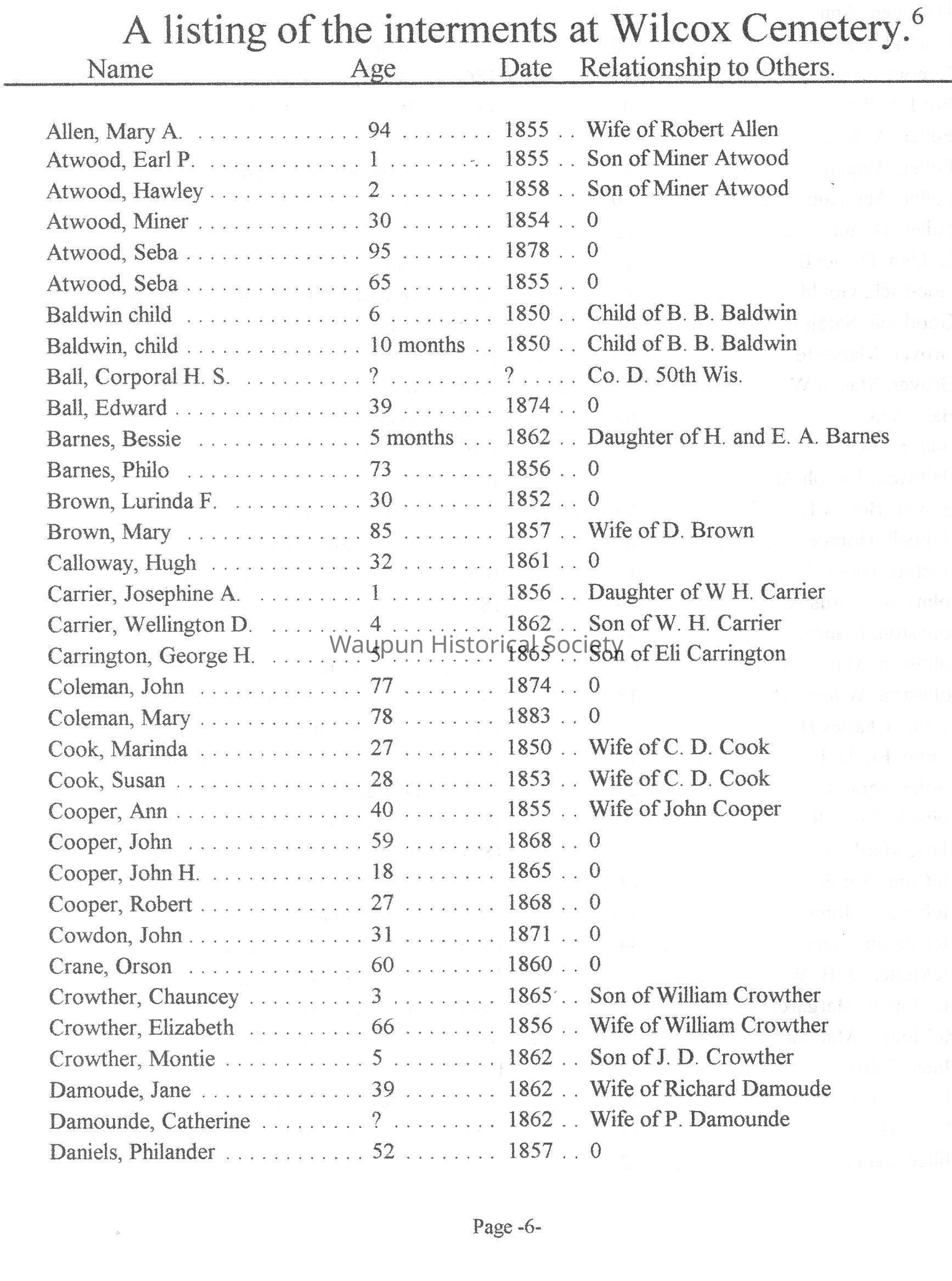 Forest Mound Cemetery records do show some of the persons that had been buried elsewhere and removed to Forest Mound, but from memory I cannot recall who they were, except for those of Mrs. Way Martin's family that were removed from the Atwater cemetery.