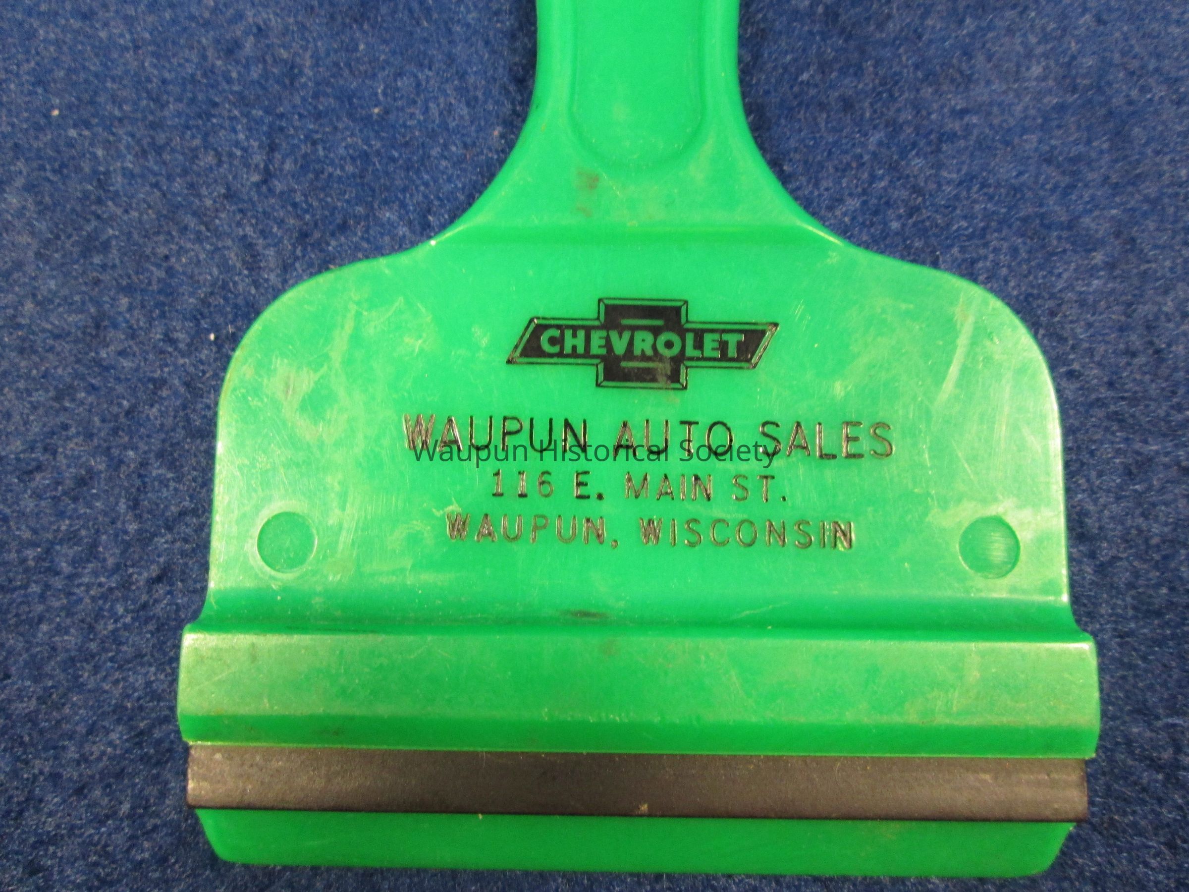 Chevrolet Waupun Auto Sales, 116 E. Main St., Waupun, Wisconsin advertising tool; a green colored car windshield ice scraper.Acquisition