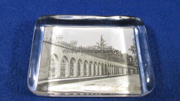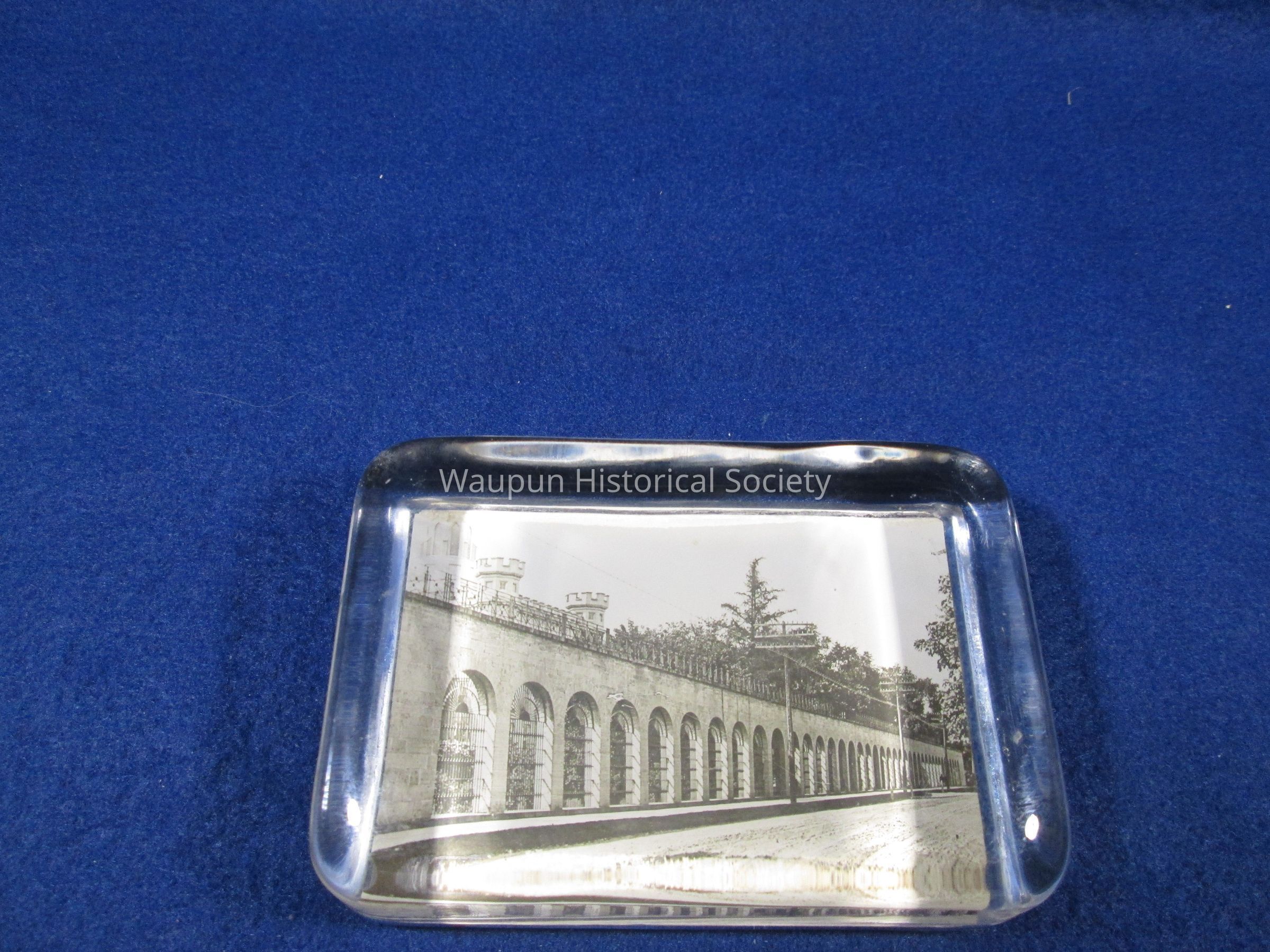 A Glass Paper Weigth for weight down some paper with a picture of the State prison in it from Waupun Wis.Acquisition