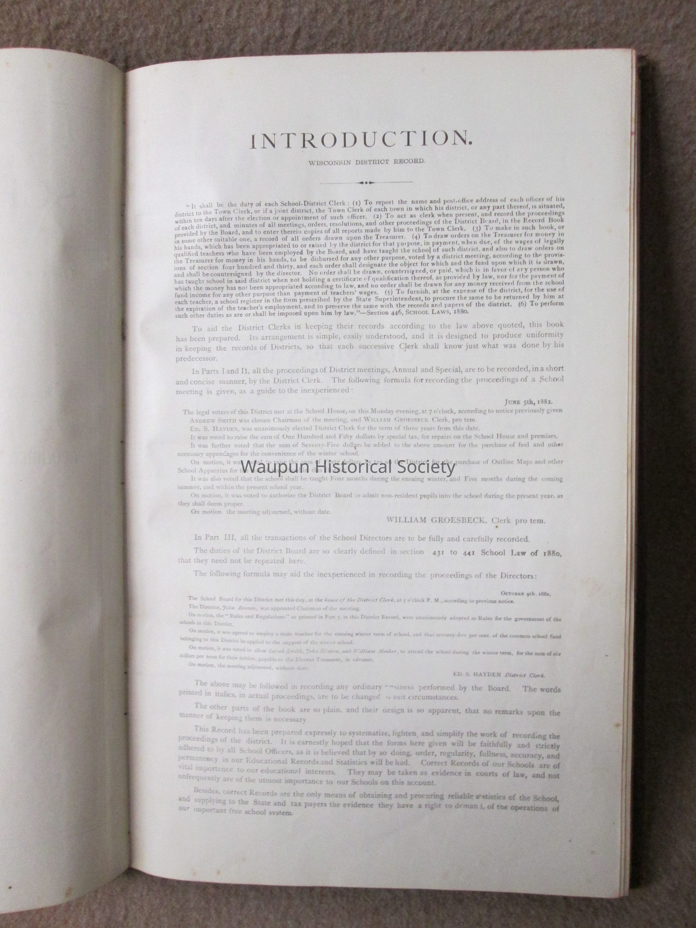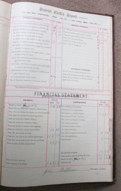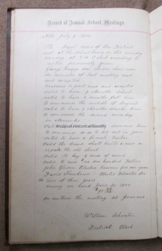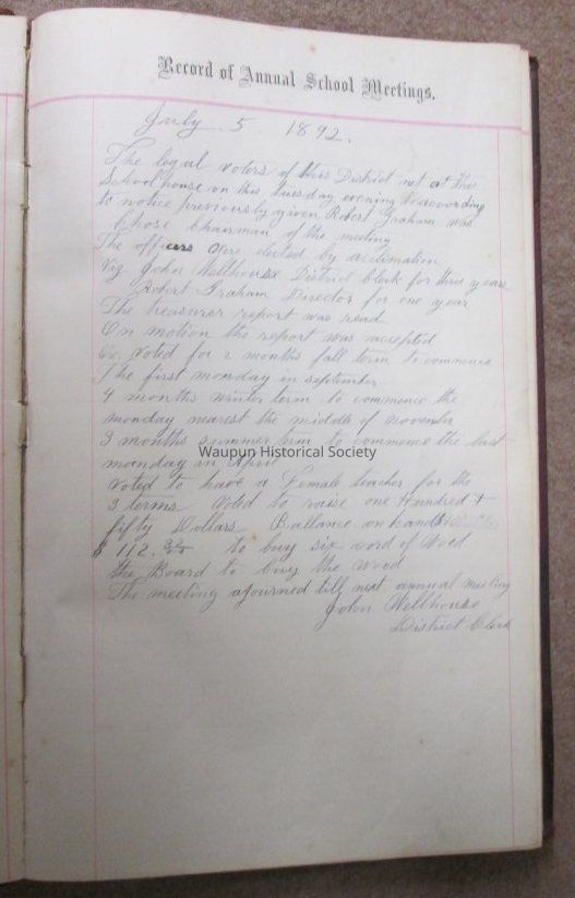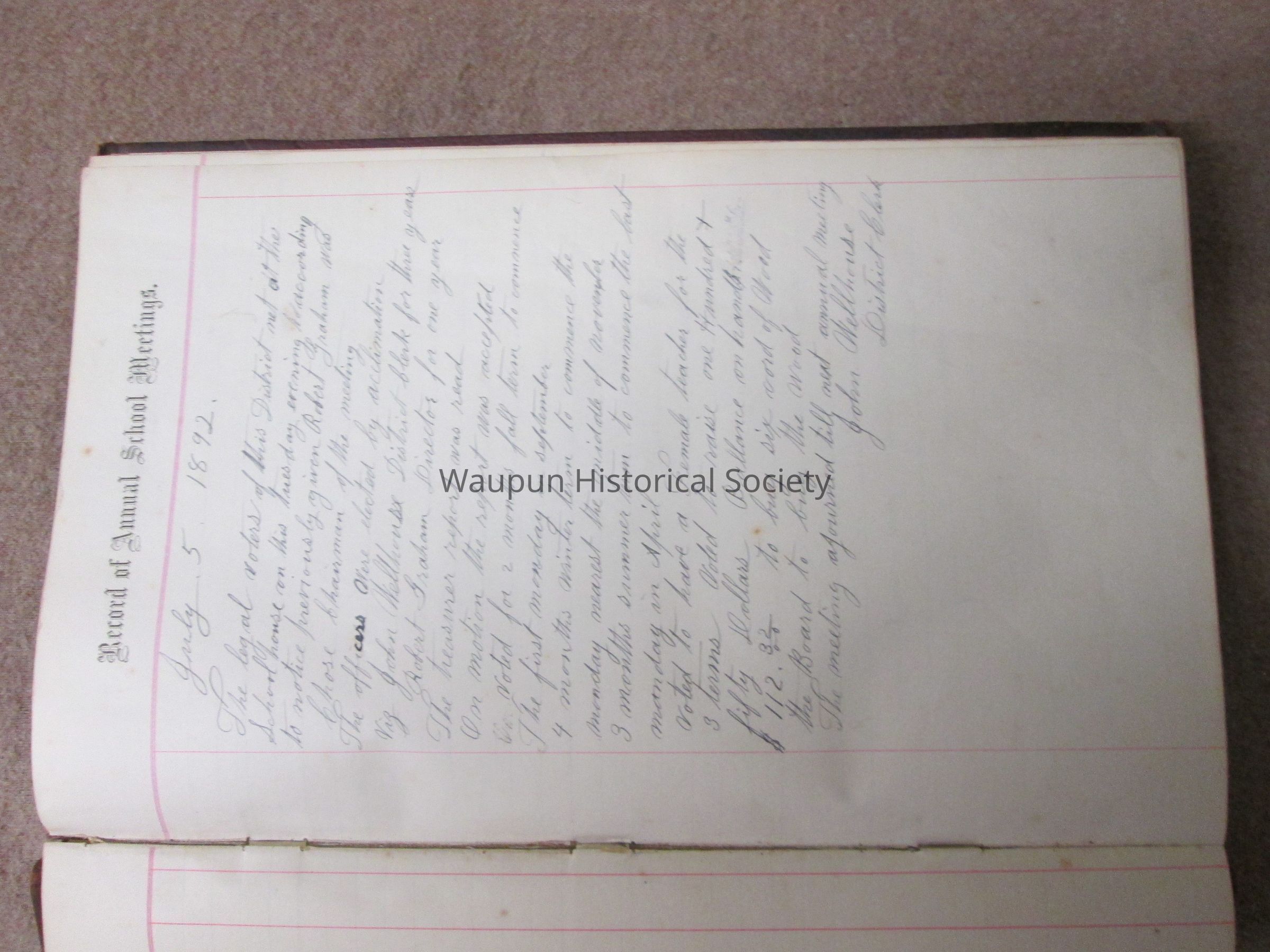 The first written record is of the Annual School Meeting, held on July 5,1892 at the school house and written by John Wellhouse, District Clerk.