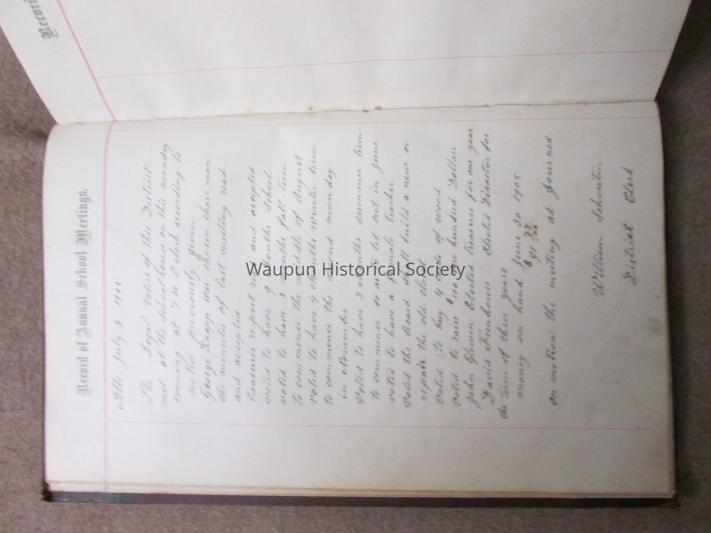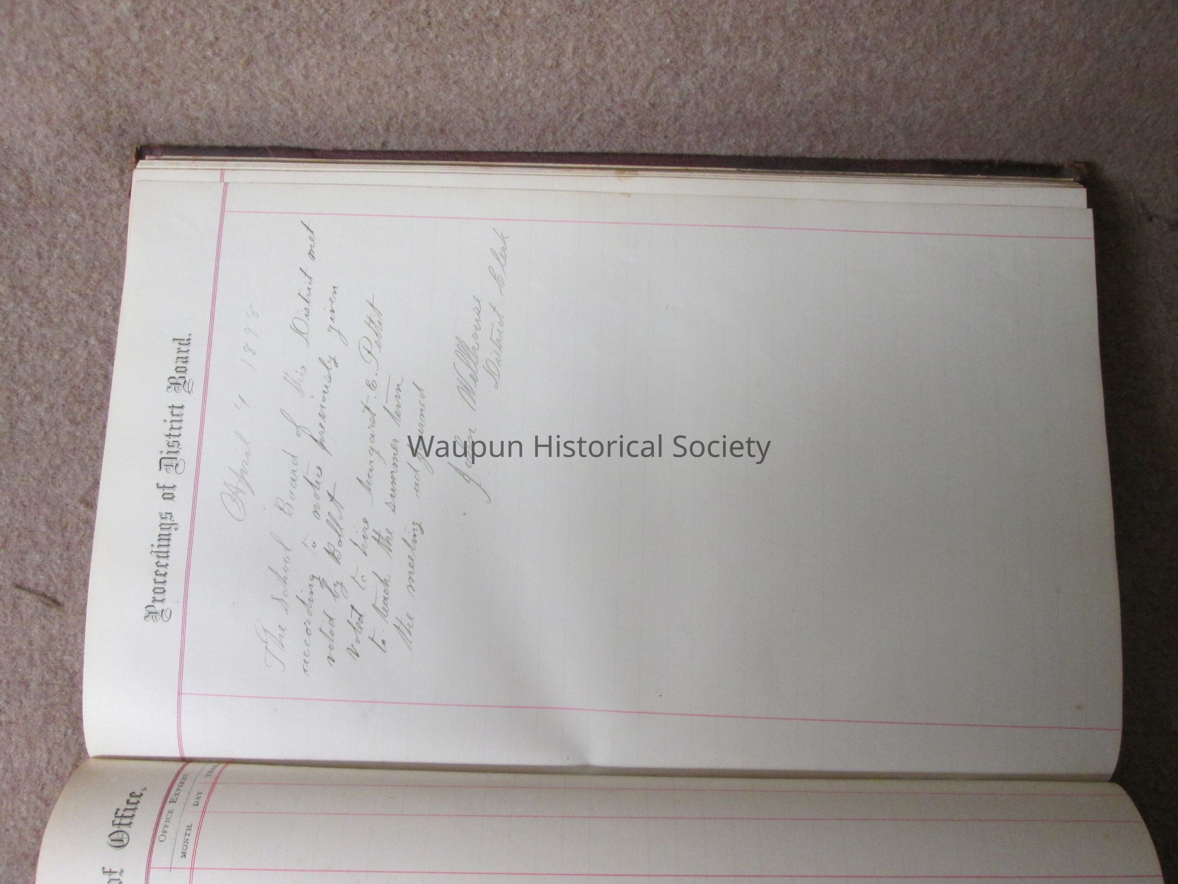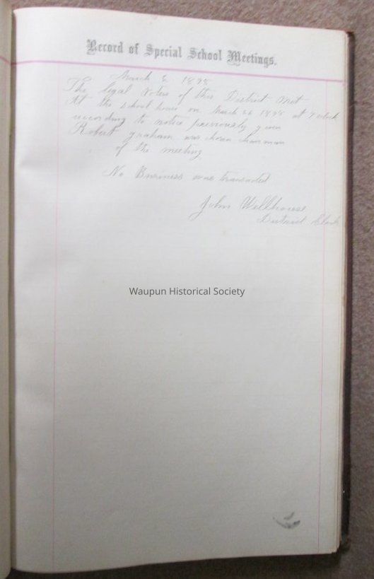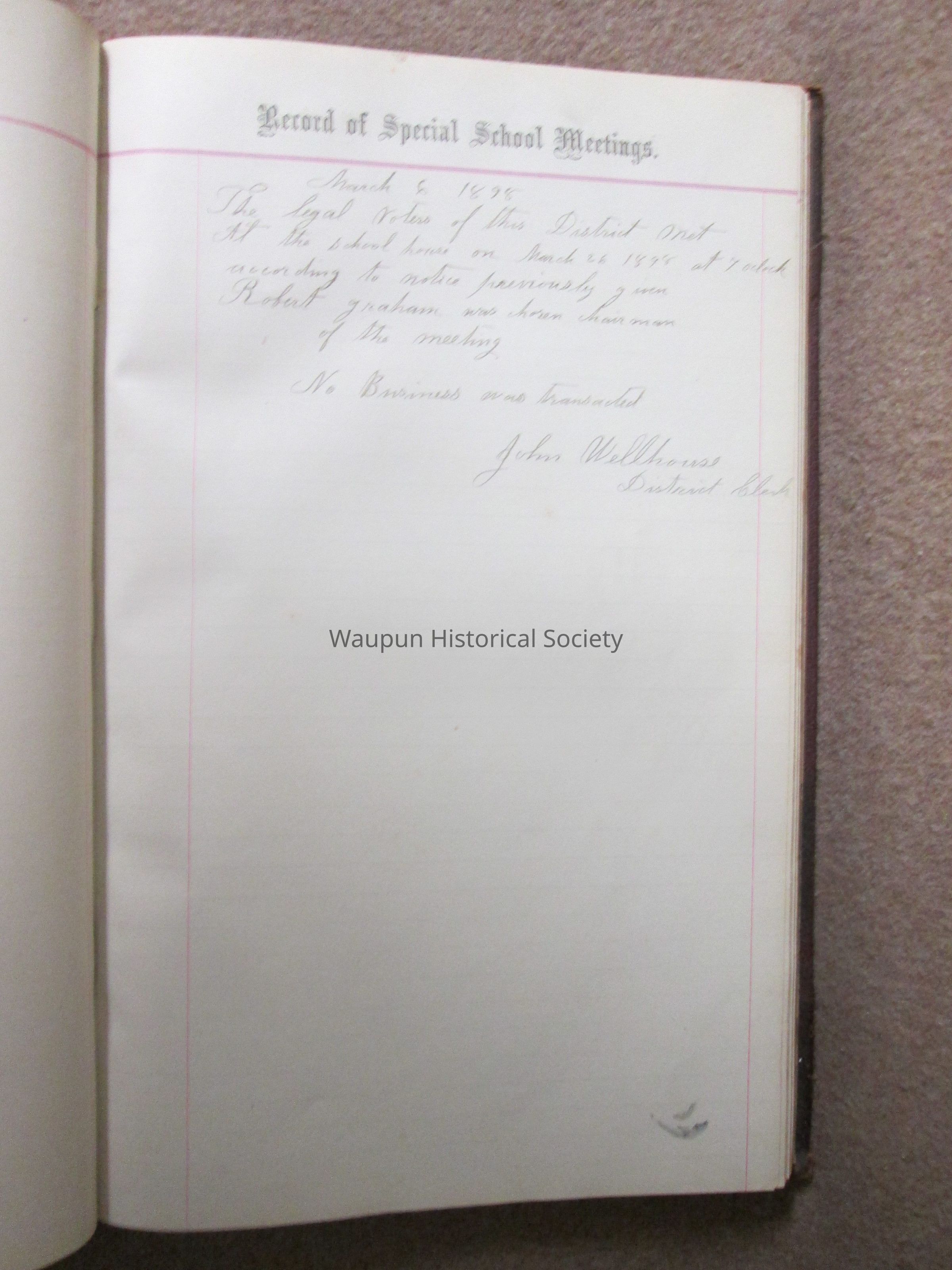 Pages for the Record of Special School Meetings has only one entry of March 6,1898 composed by John Wellhouse, District Clerk.