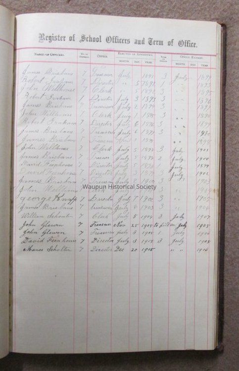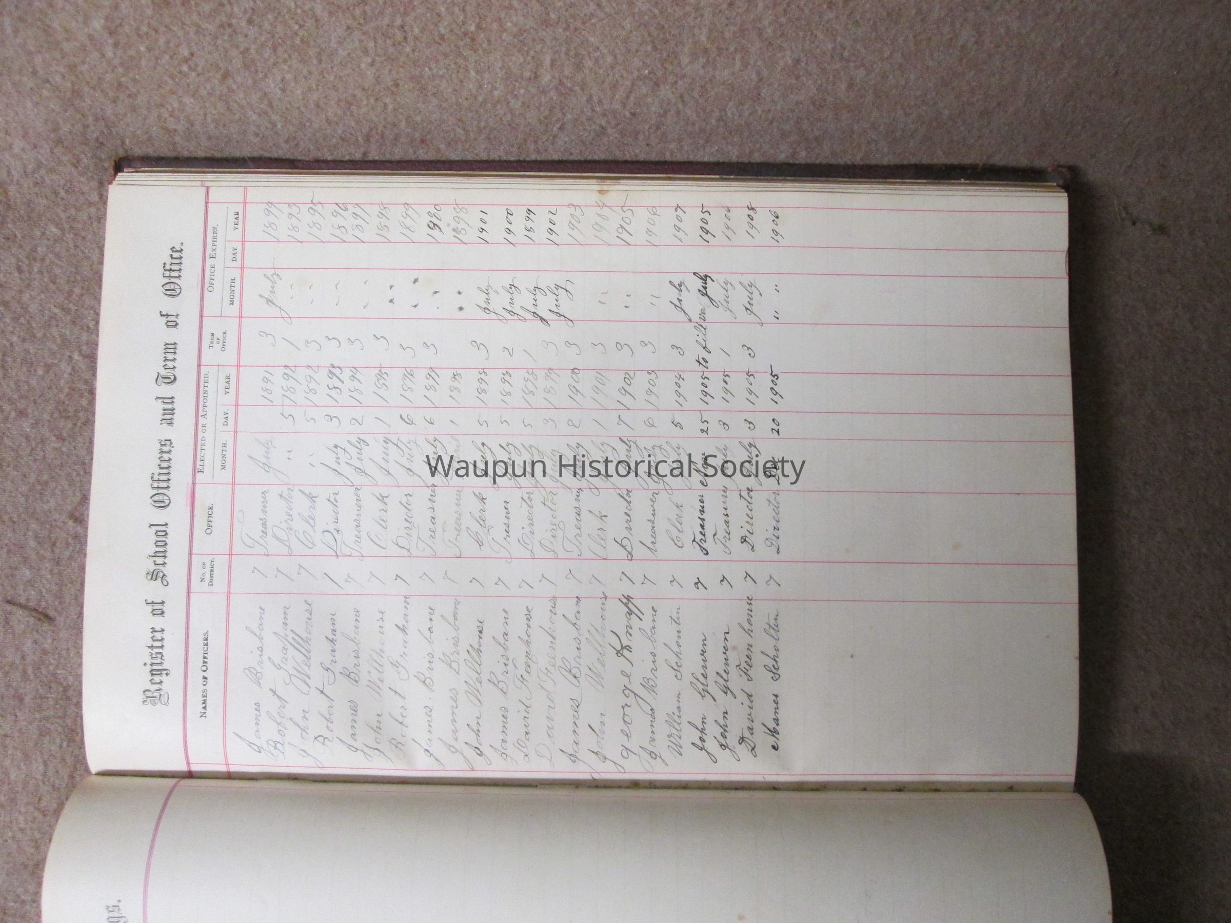 The Register of School Officers and Term of Office elections or appointments recorded begin in July 1891 thru December 1905.