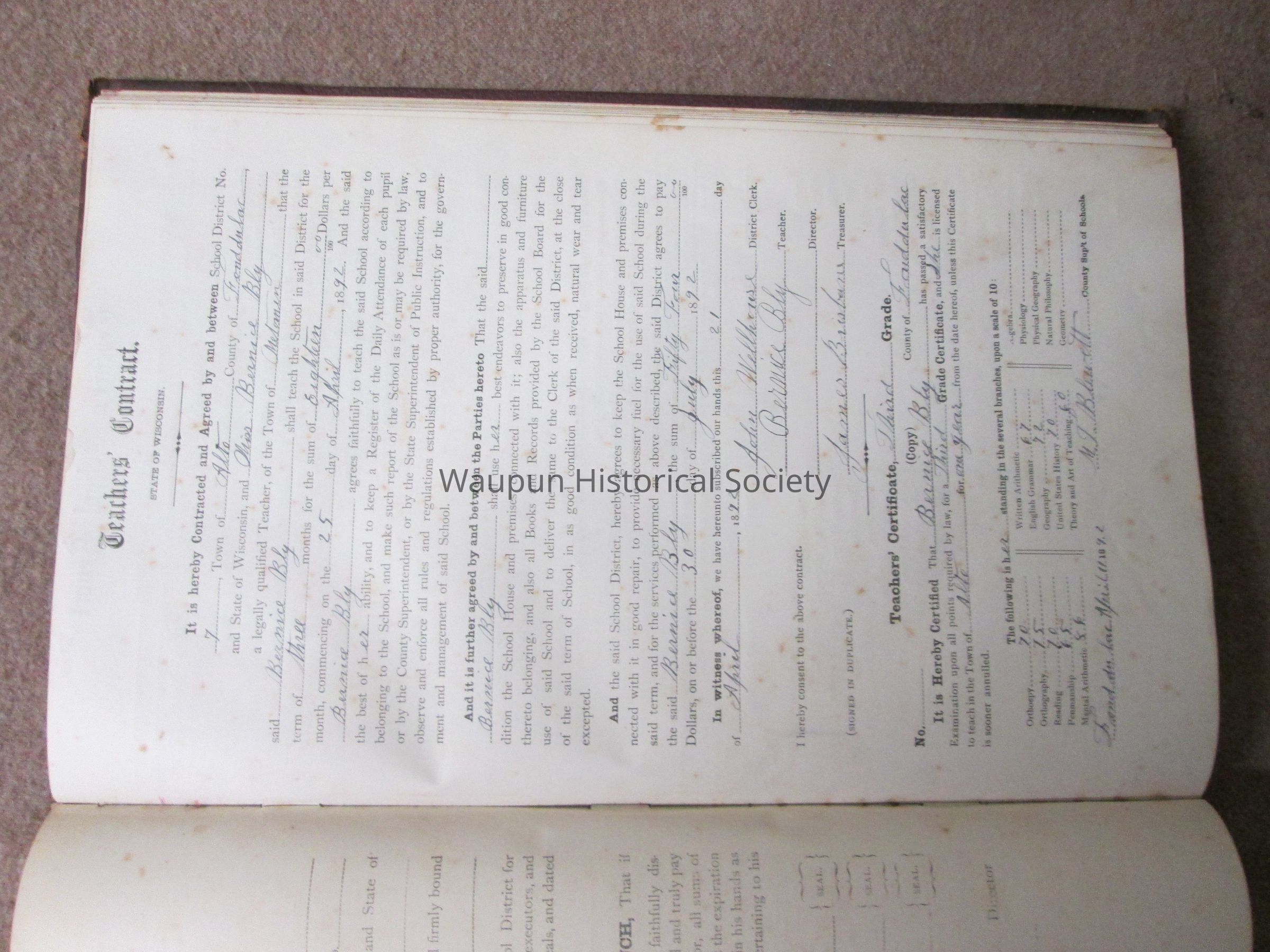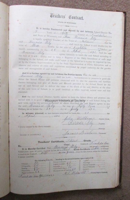 Teachers' Contract with Teacher's School Report. The earliest contract with Bernice Bly on April, 21,1892. John Wellhouse signed as District Clerk.