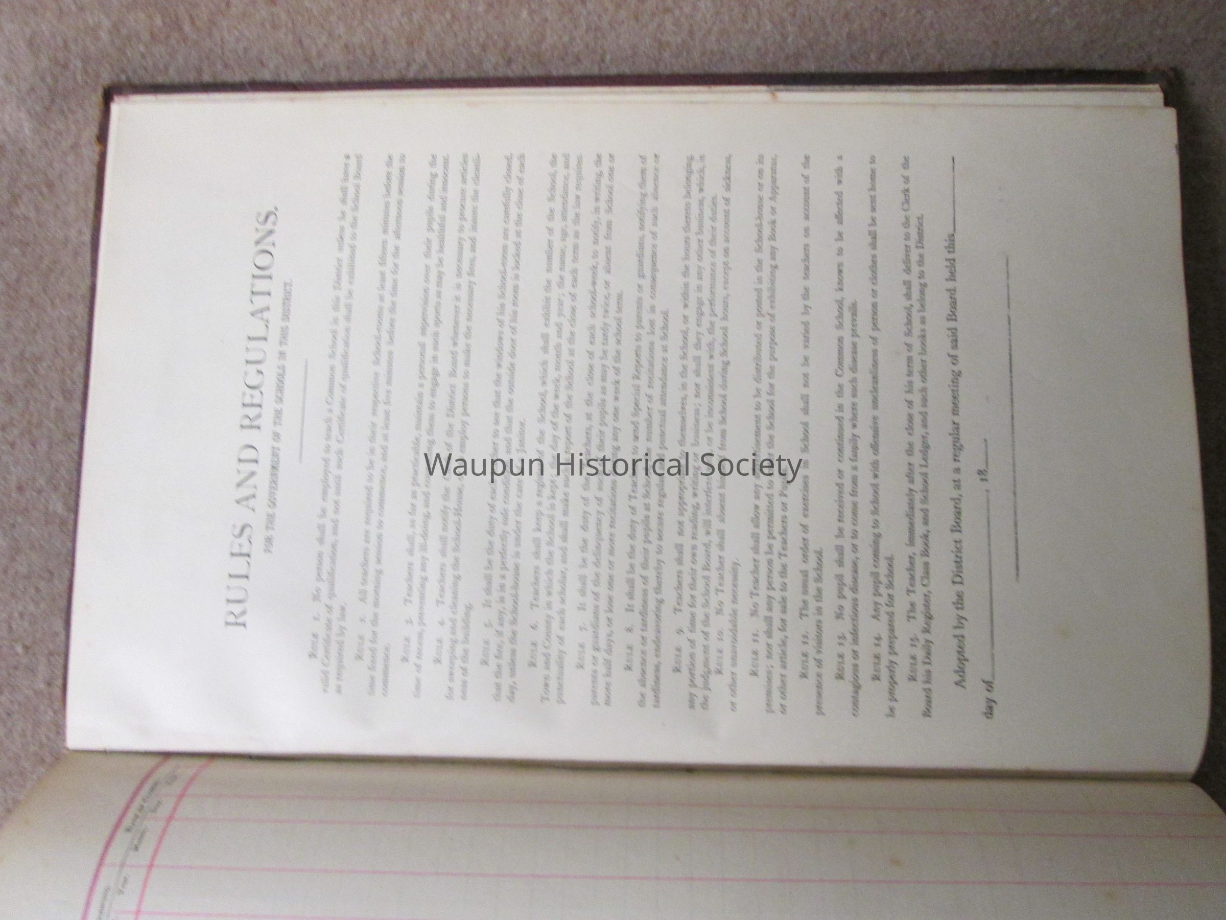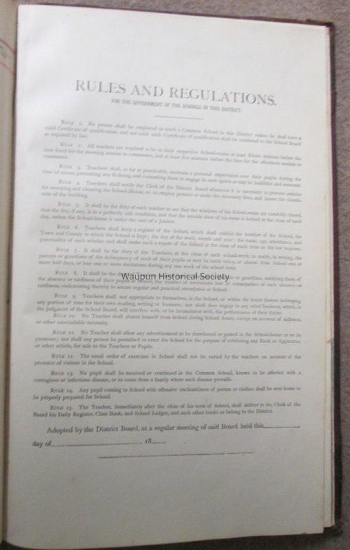 RULES AND REGULATIONS for the Government of the schools in this district and Rules and Regulations Adopted pages were left blank.