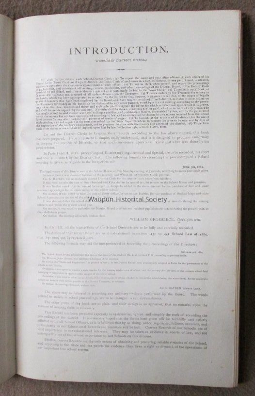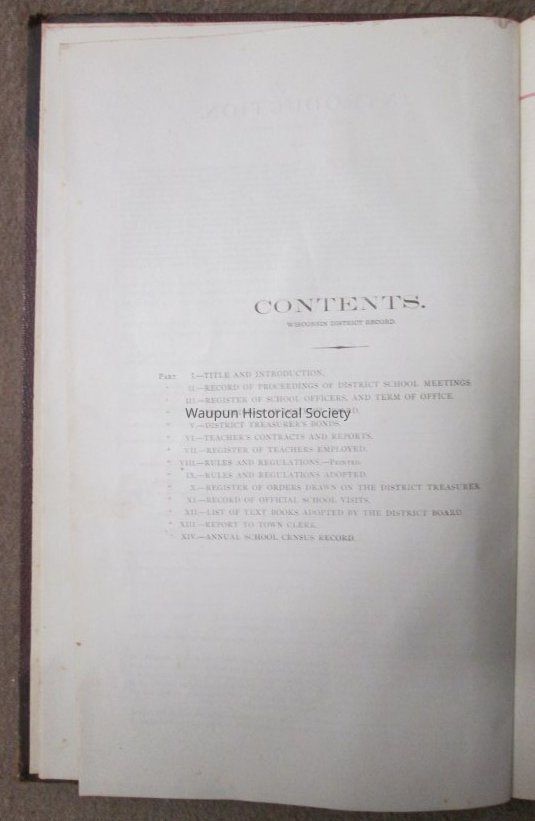 Begins with District SCHOOL RECORD for District No.7, Town of Alto County of Fond du lac and the State of Wisconsin. followed by the page of INTRODUCTION as to the use of this record. The table of contents and Index pages follow.