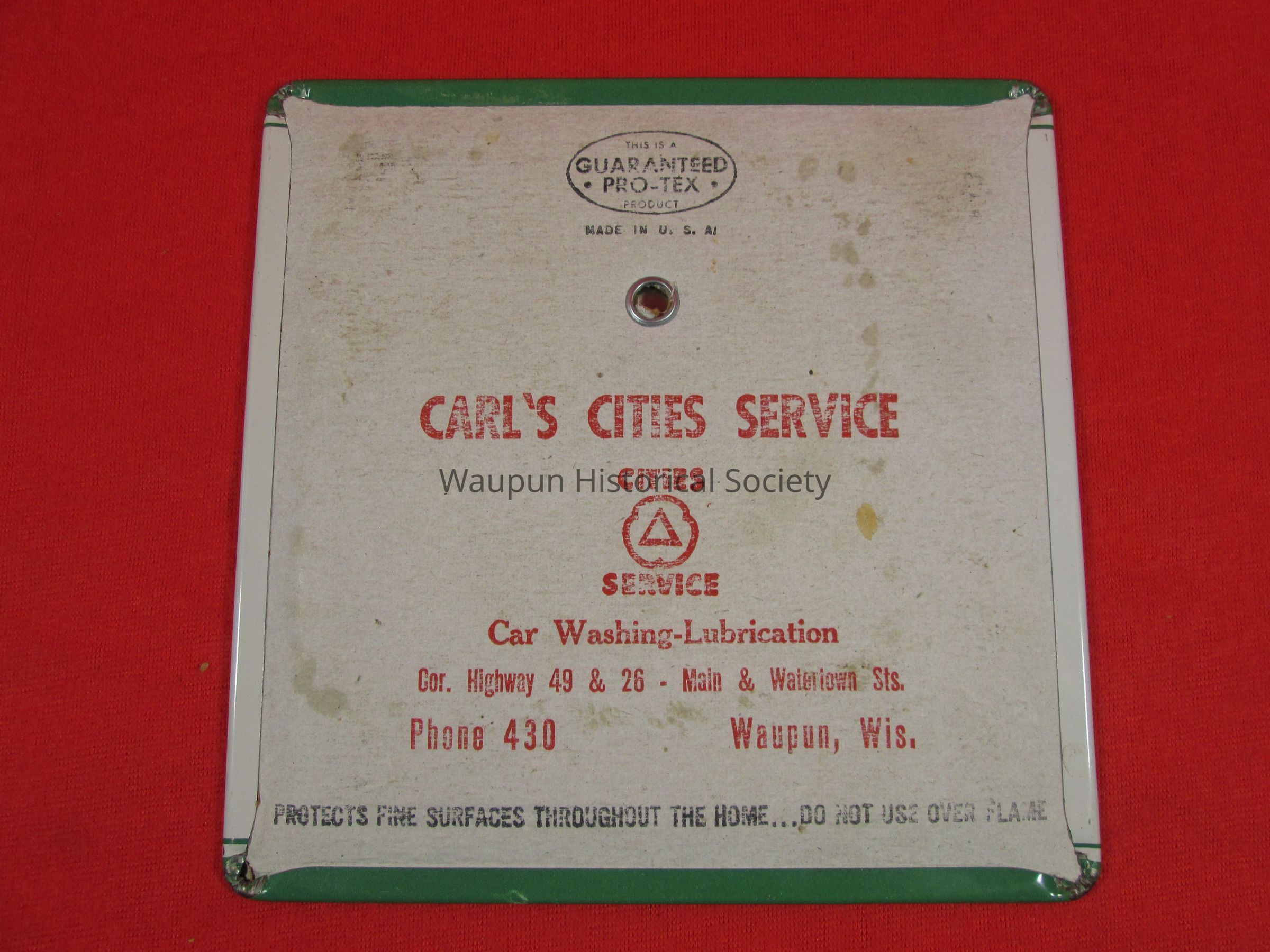 A square shaped trivet advertising Carl's Cities Service, Car Washing-Lubrication, Cor. Highway 49 & 26 - Main & Watertown Sts., Phone 430, Waupun, Wis. It has 2 red delicious apples on a stem applicade on the front which is a white background with green trim. Also printed on the back - This is a guaranteed *Pro-Tex* Product, made in U.S.A. - Protects Fine Surfaces Throughout The Home . . . Do Not Use Over Flame.Acquisition