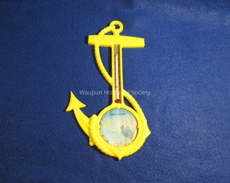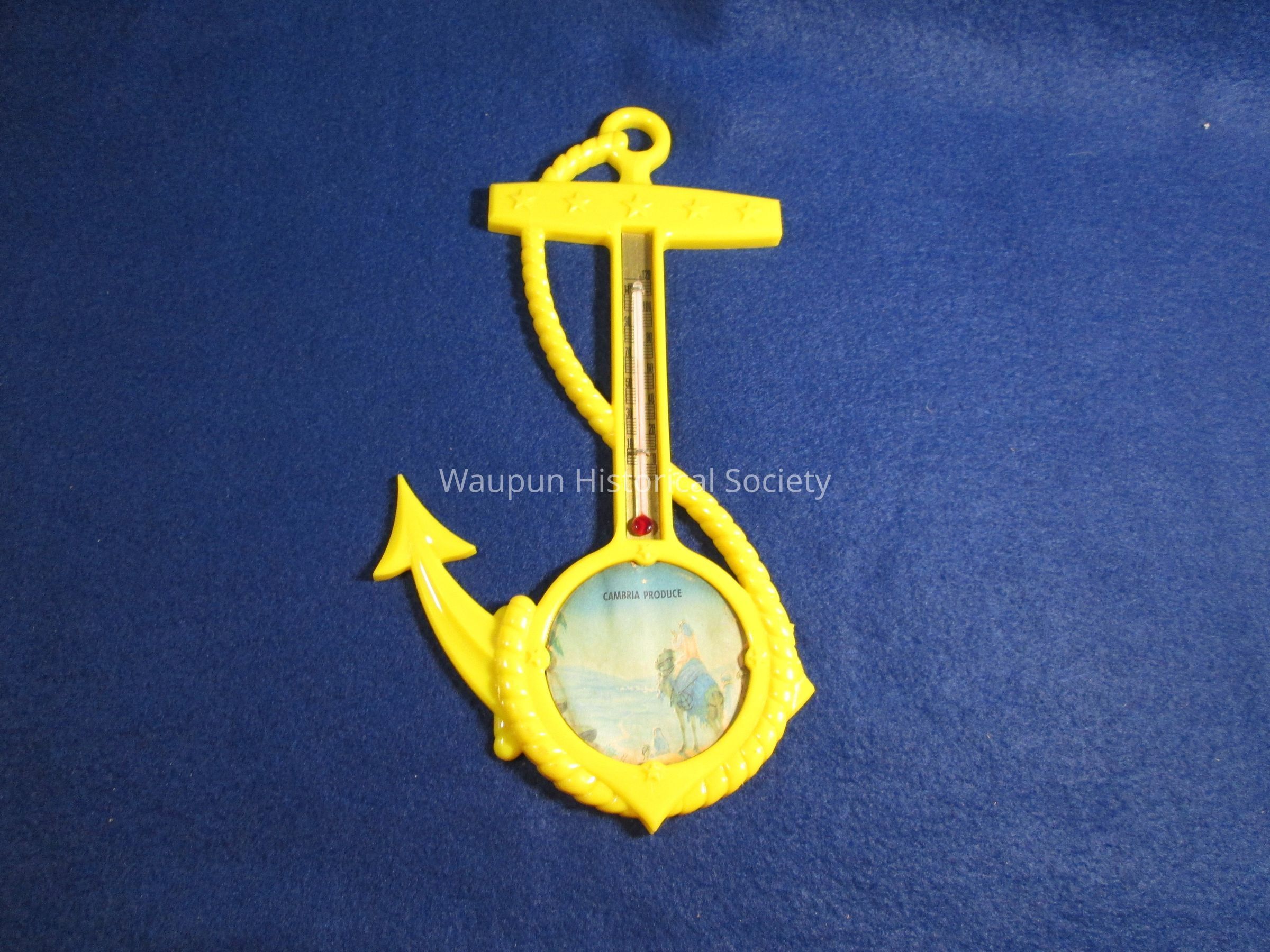 A weather Thermometer Yellow in Color and With a picture of Cambria Produce on it.Acquisition