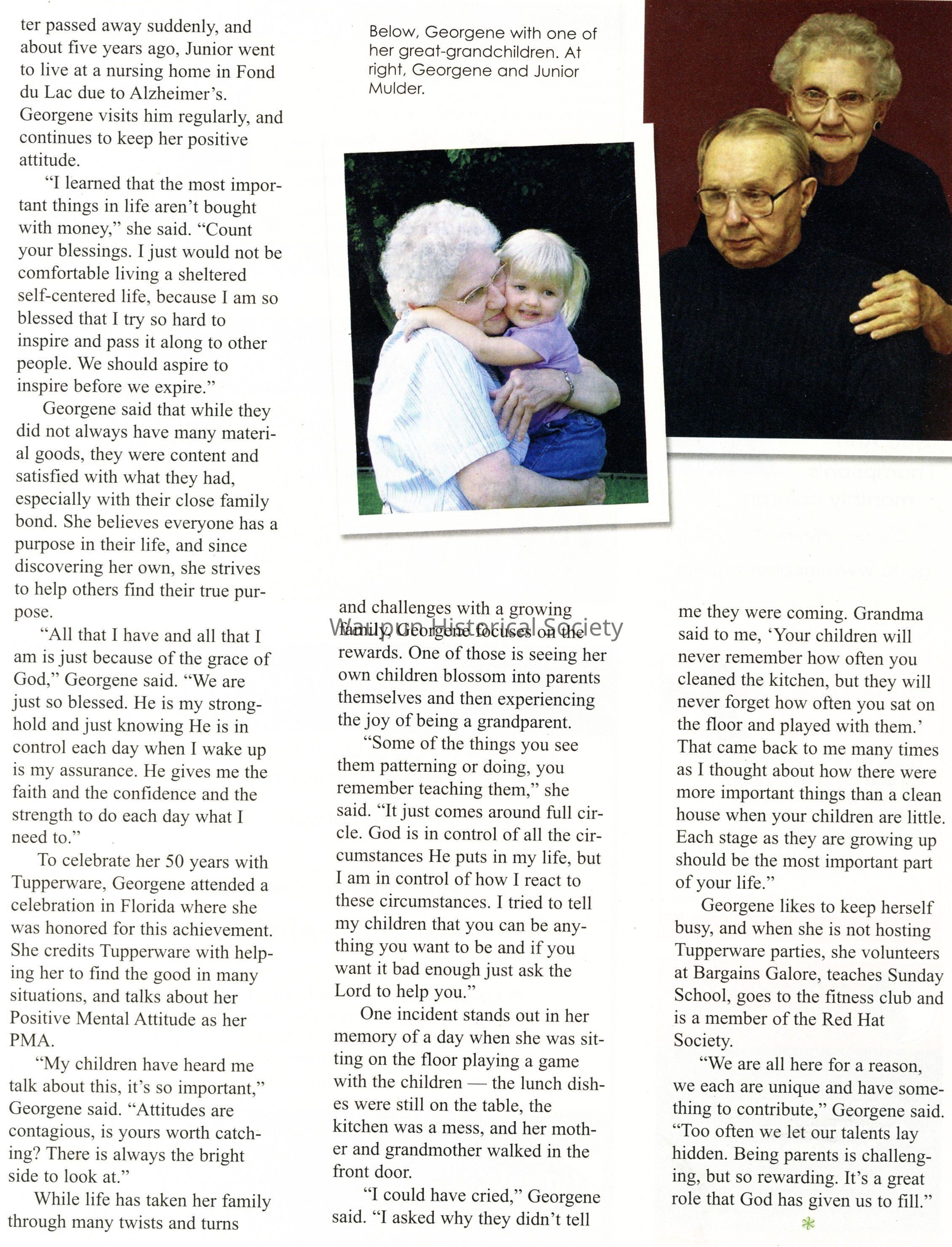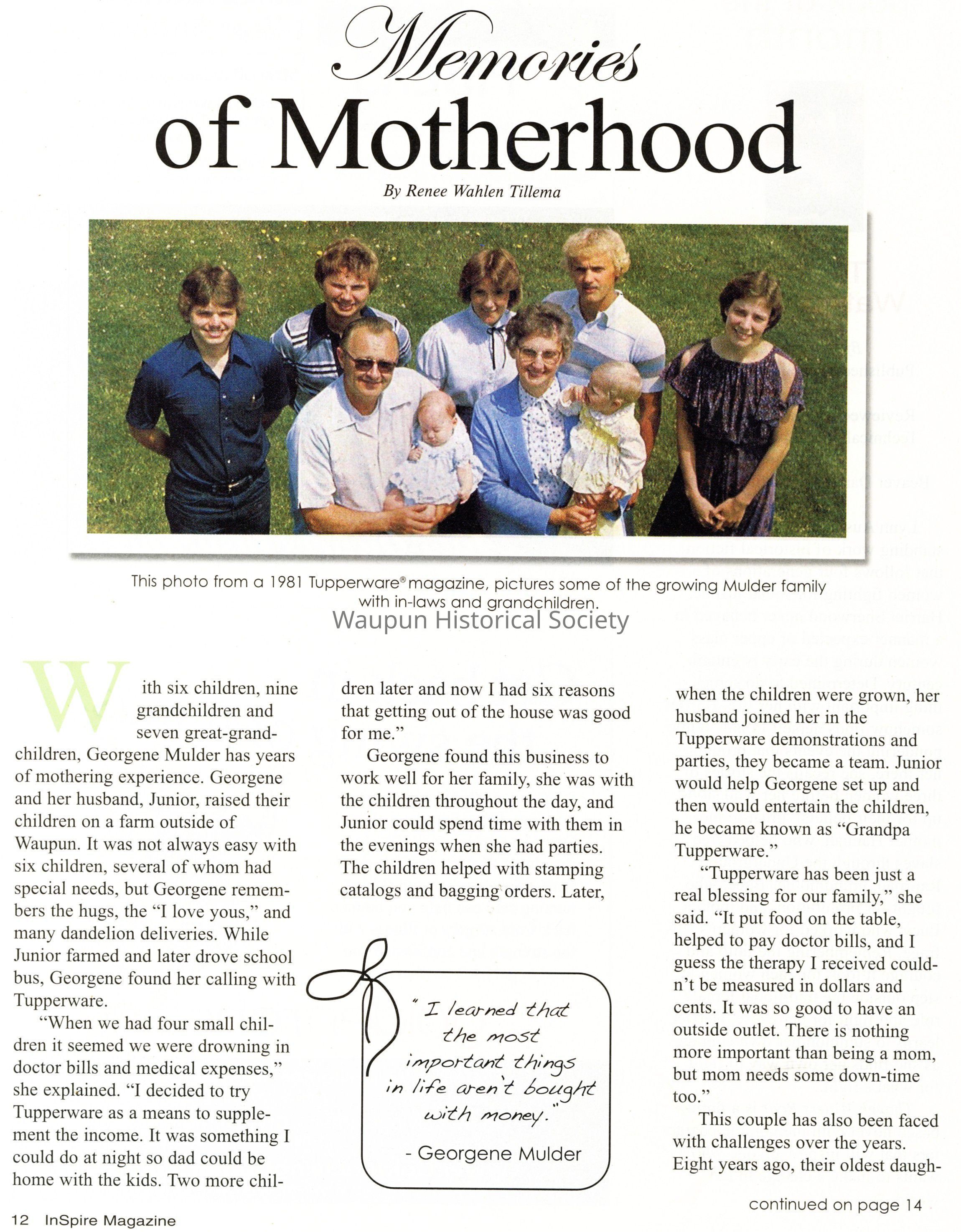 With six children, nine grandchildren and seven great-grandchildren, Georgene Mulder has years of mothering experience. Georgene and her husband, Junior, raised their children on a farm outside of Waupun. It was not always easy with six children, several of whom had special needs, but Georgene remembers the hugs, the "I love yous," and many dandelion deliveries. While Junior farmed and later drove school bus, Georgene found her calling with Tupperware.