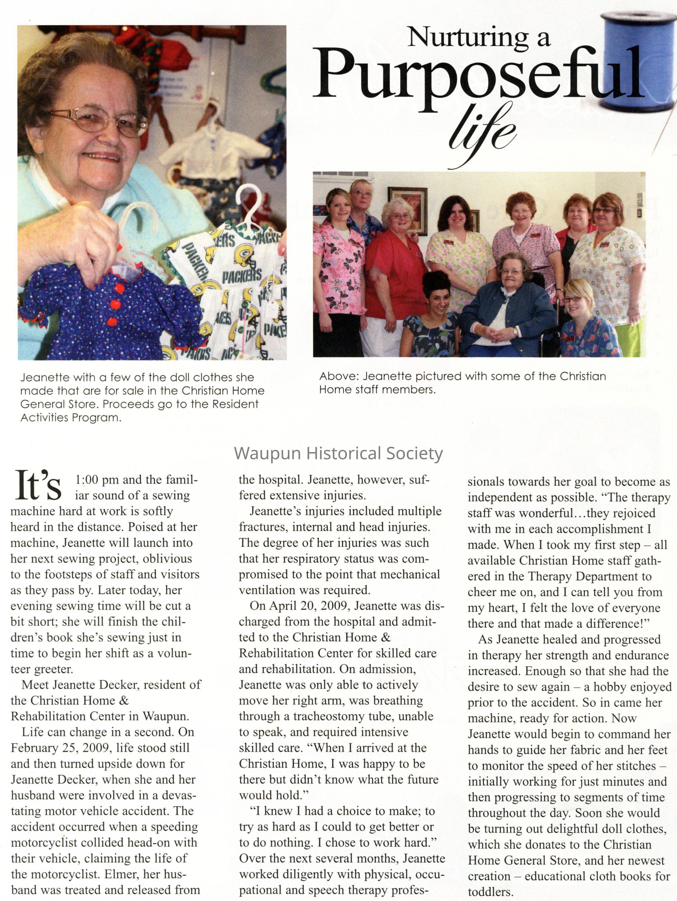Sewing isn't the only thing giving Jeanette purpose. She also is a Christian Home volunteer, participating two evenings per week as a greeter at the reception desk. "Jeanette is truly an inspiration to the staff of the Christian Home & Rehabilitation Center," said Fawn Senn, Social Worker. "She inspires all of us to value life and make the best of the hand we are dealt."