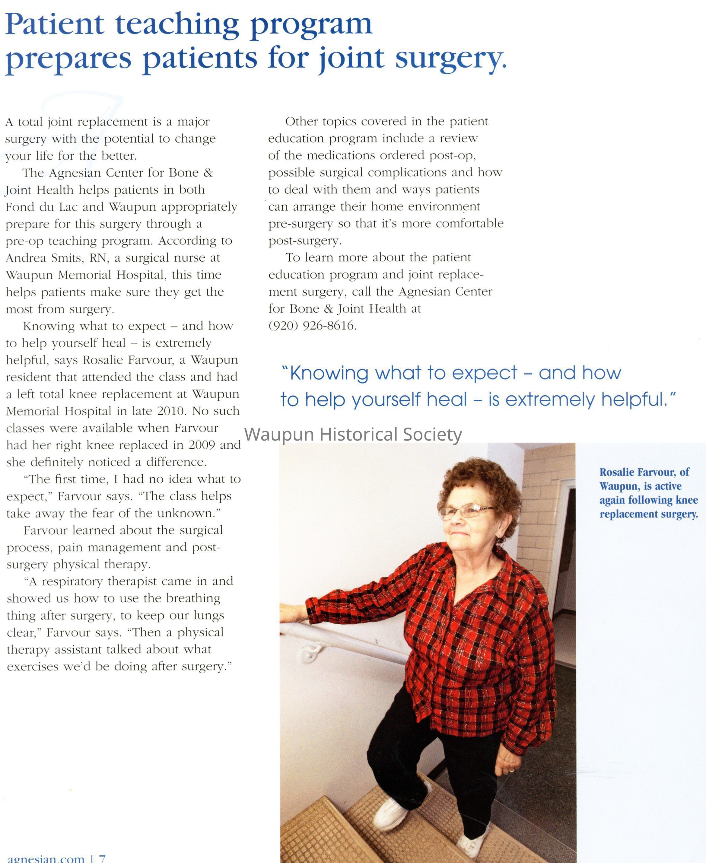 Knowing what to expect — and how to help yourself heal — is extremely helpful, says Rosalie Farvour, a Waupun resident that attended the class and had a left total knee replacement at Waupun Memorial Hospital in late 2010. No such classes were available when Farvour had her right knee replaced in 2009 and she definitely noticed a difference.