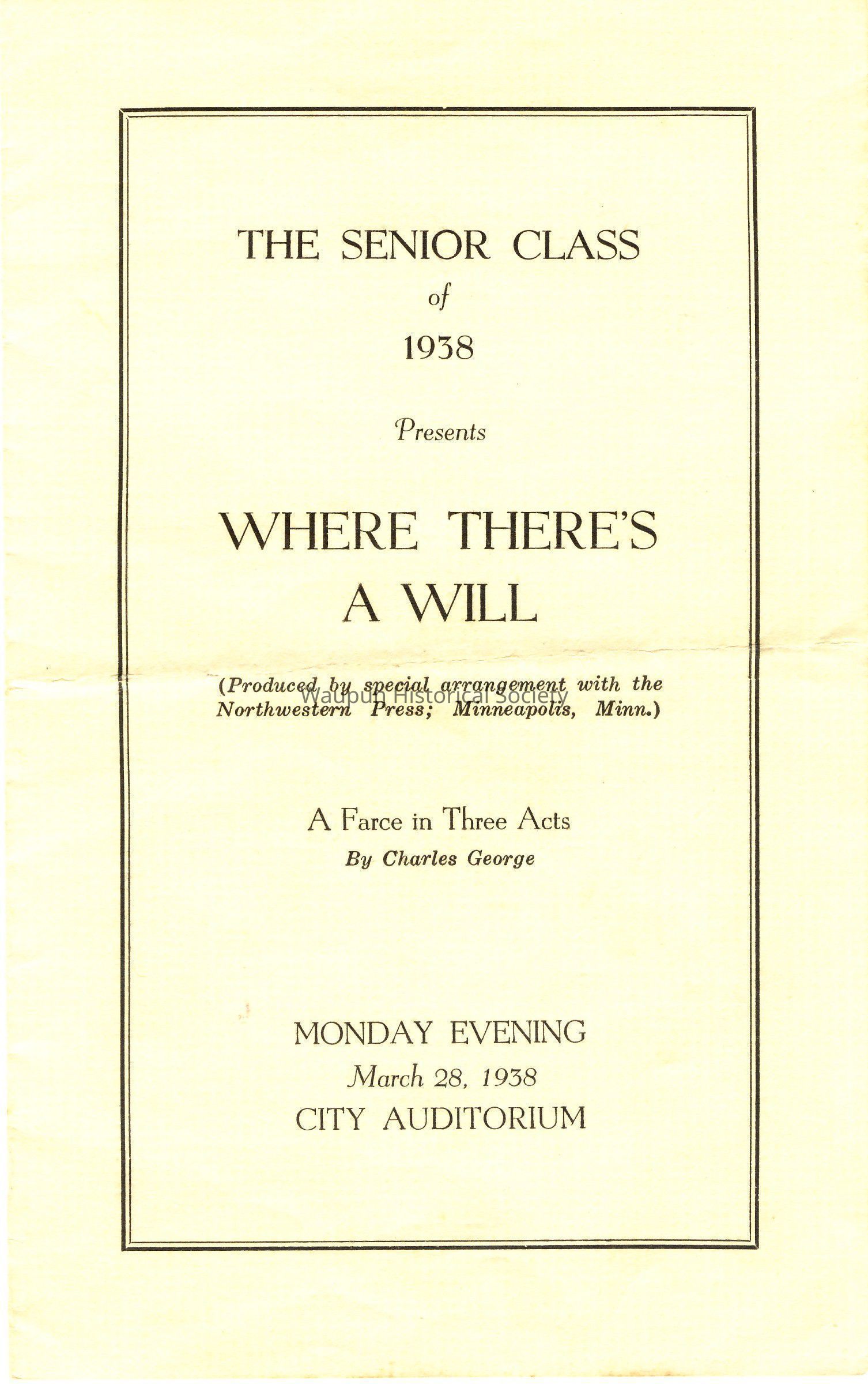 Program, The Senior Class Play, Where There's a Will, Class of 1938Entry/Object ID
