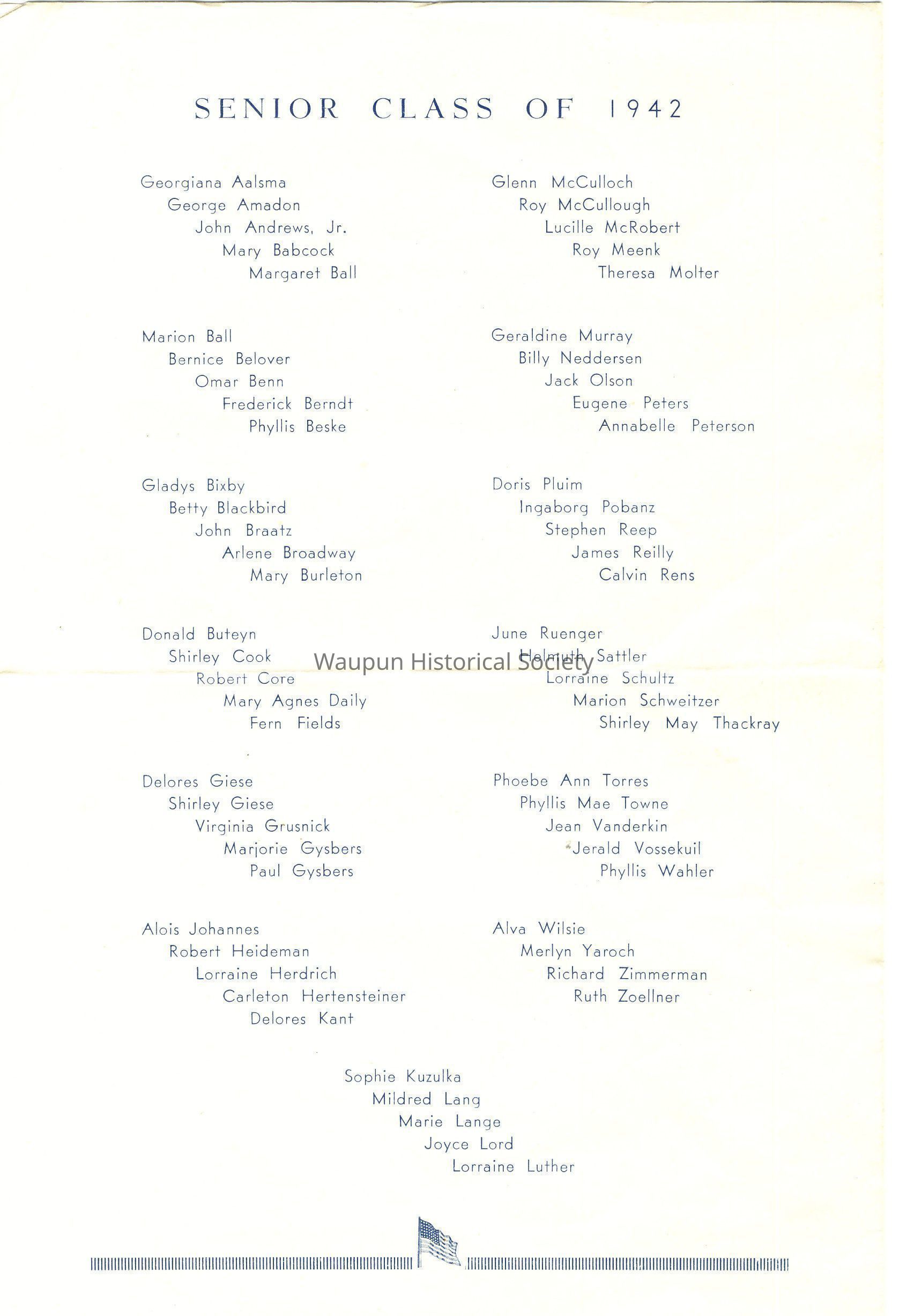 1942 Waupun HS Commencement program. Jerald Vossekuil, brother to Angeline Vossekuil, was a graduate of 1942.