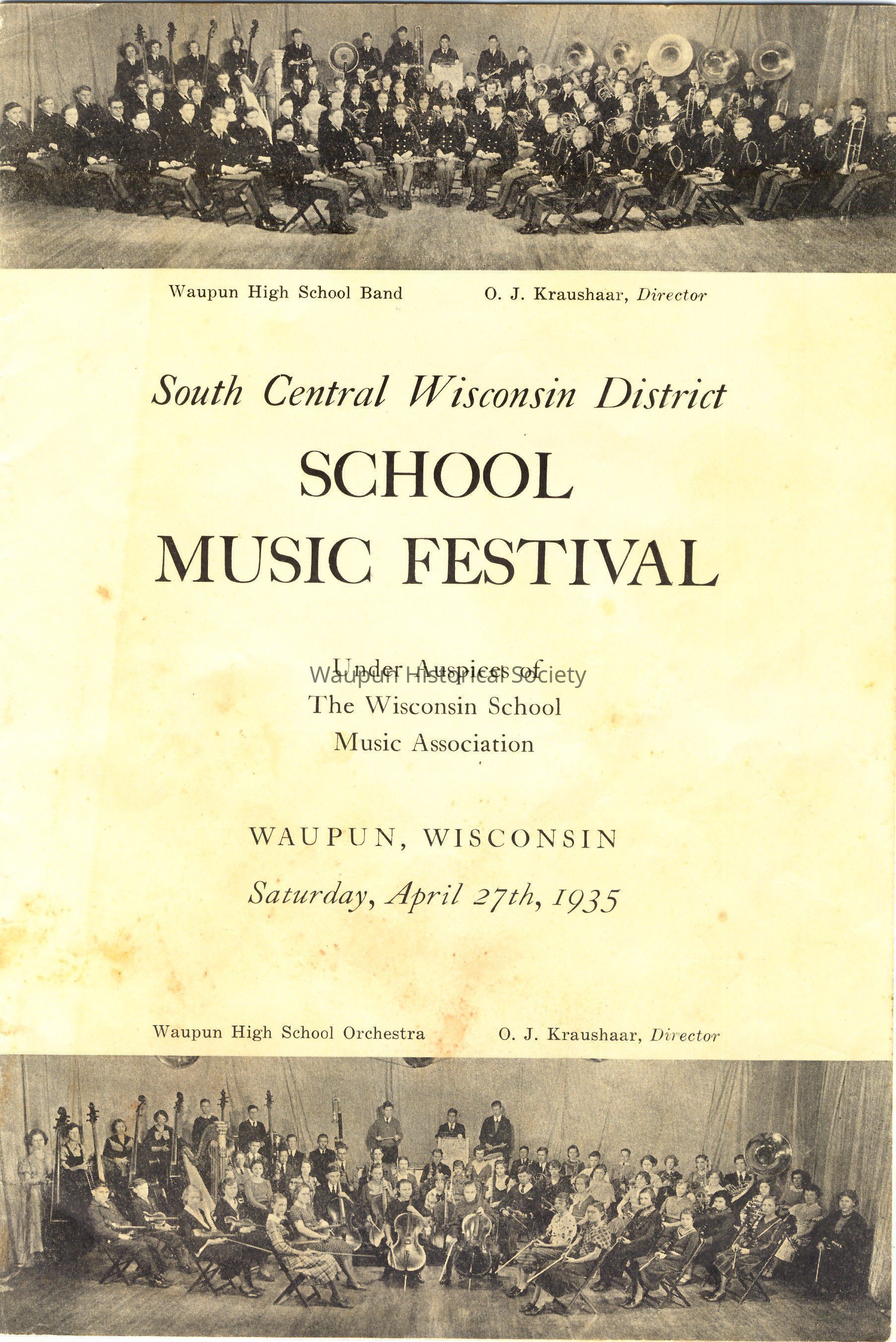 Program of the South Central Wisconsin District SCHOOL MUSIC FESTIVAL held at Waupun, Wisconsin, Saturday, April 27th, 1935. The front cover has a photo of th Waupun High School Band under the direction of O. J. Krashaar and a photo of the Waupun High School Orchestra with O. J. Kraushaar, director. Back cover page also lists sponsors and has a photo of the Waupun High School Glee Club, Miss Ern Pugh, Director. There are six pages of sponsors after the program pages.