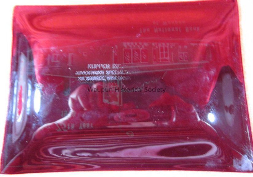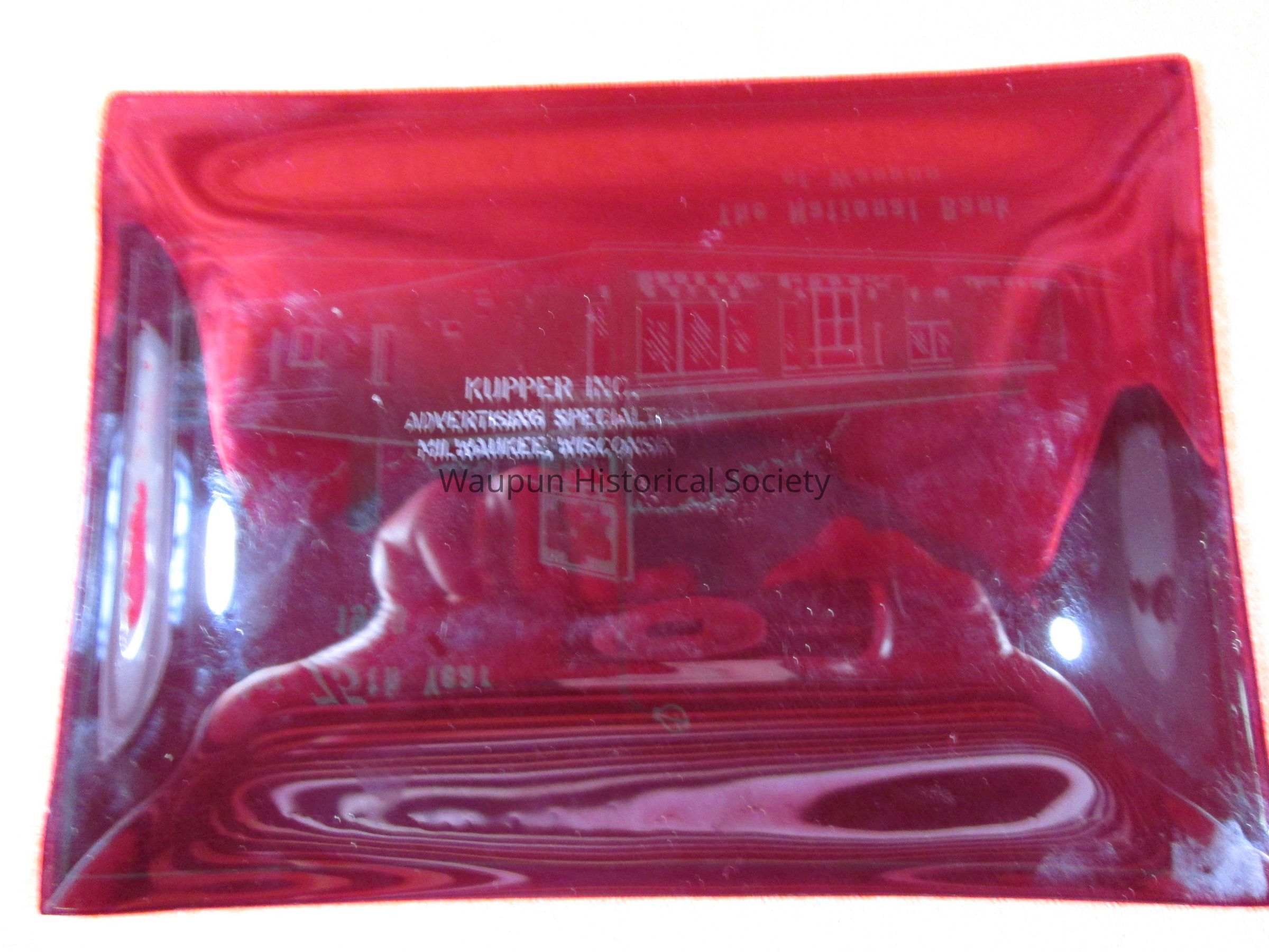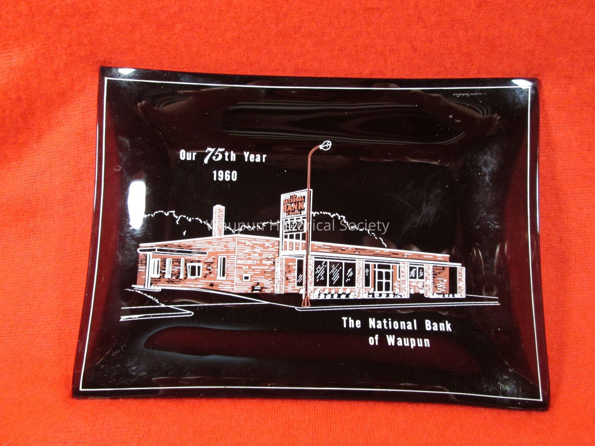 Clear black glass rectangular dish with a white line border. A picture of The National Bank of Waupun is painted on the front with "Our 75th Year 1960" printed on it, also.