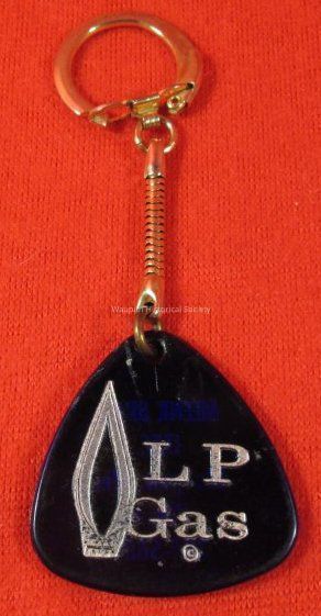 Blue, triangular shaped key holder with gold clamp advertising Meenk Bro. Elec. Waupun, Wis. phone: 324-5681 on one side. A silver flame with LP Gas is embossed on the other side.Acquisition