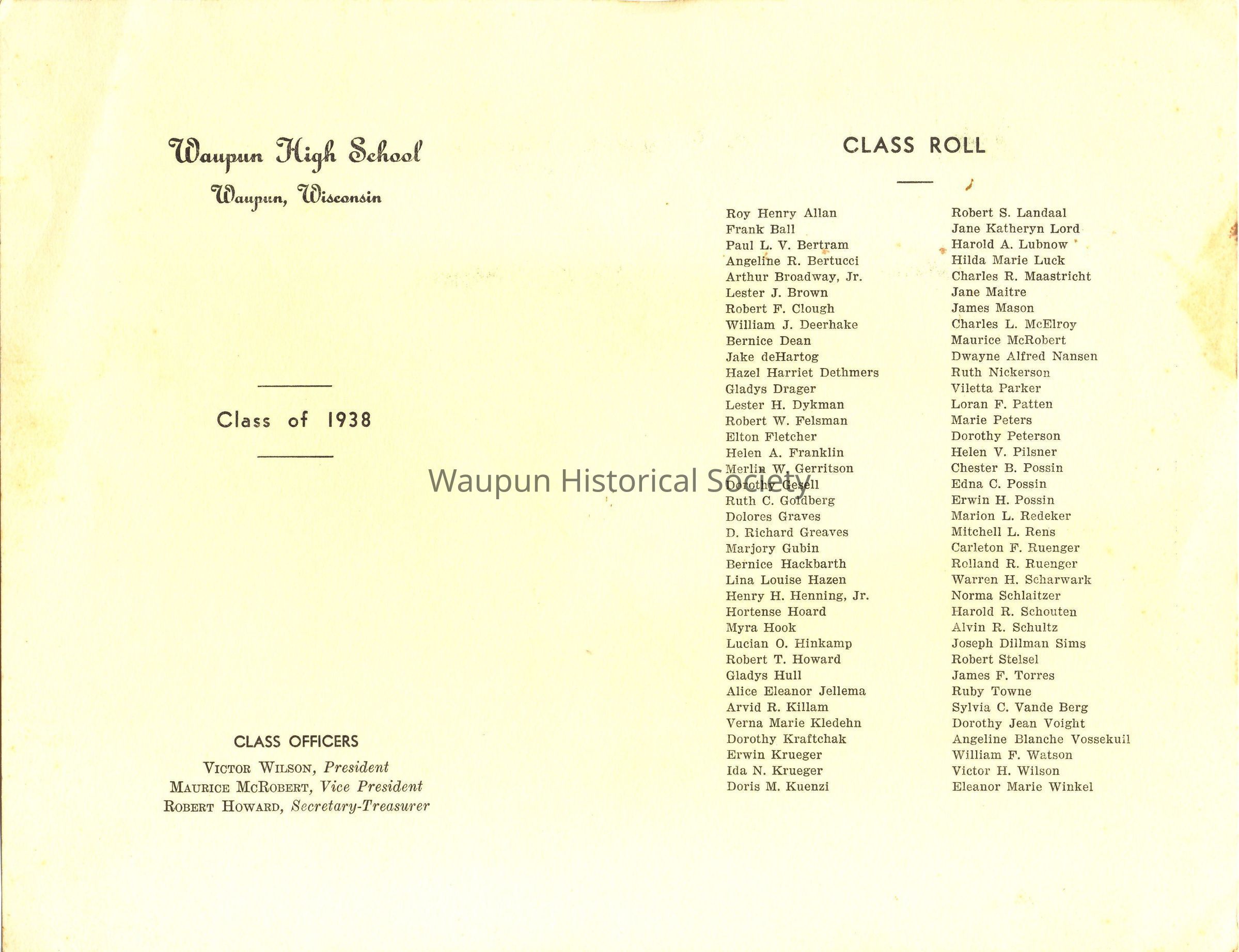 Waupun High School - Class of 1938 - June 10, 1938 is typed on front of heavy vanilla colored paper. The Waupun HS emblem is also stamped in the center of this correspondence which has Class Officers and Class Roll listed.