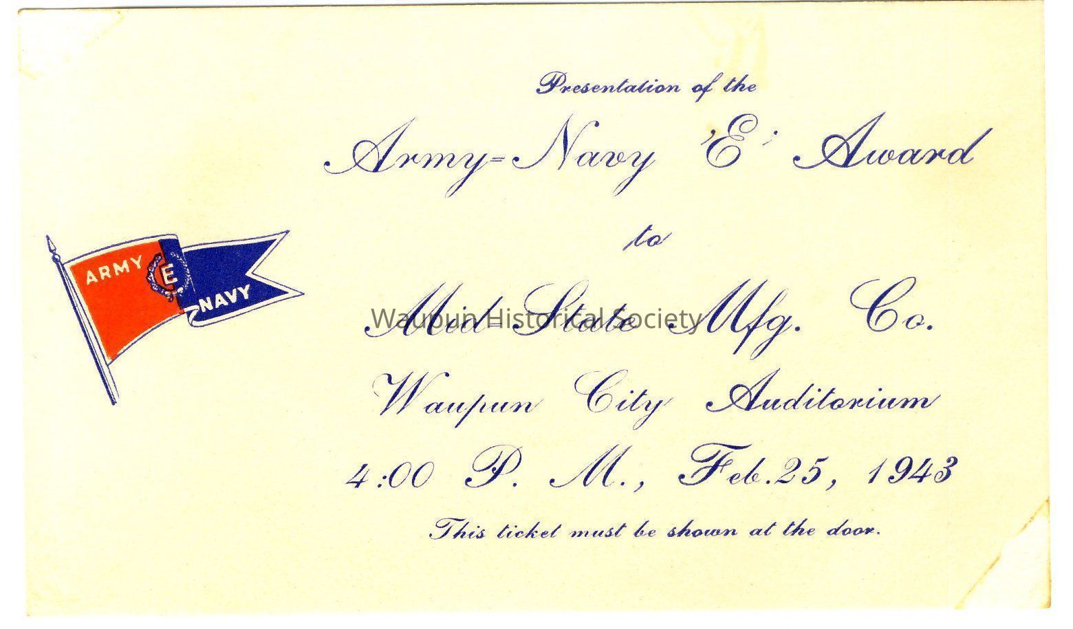 Ticket to Presentation of the Army - Navy 'E' Award to Mid-State Mfg. Co., Waupun City Auditorium, 4:00 P. M., Feb. 25, 1943.